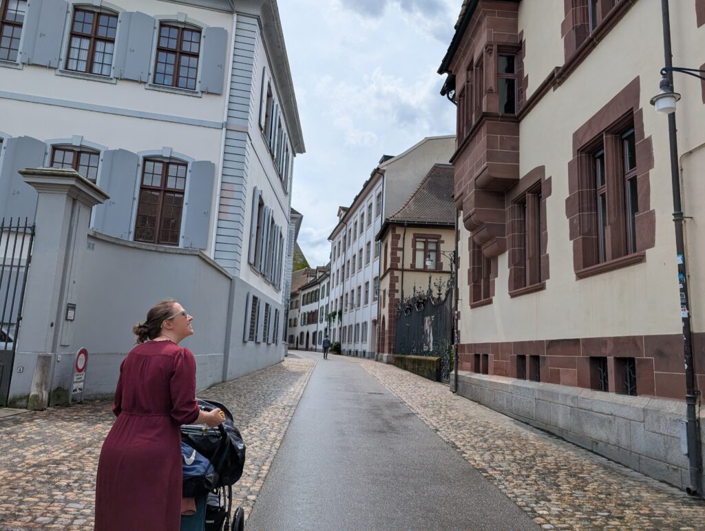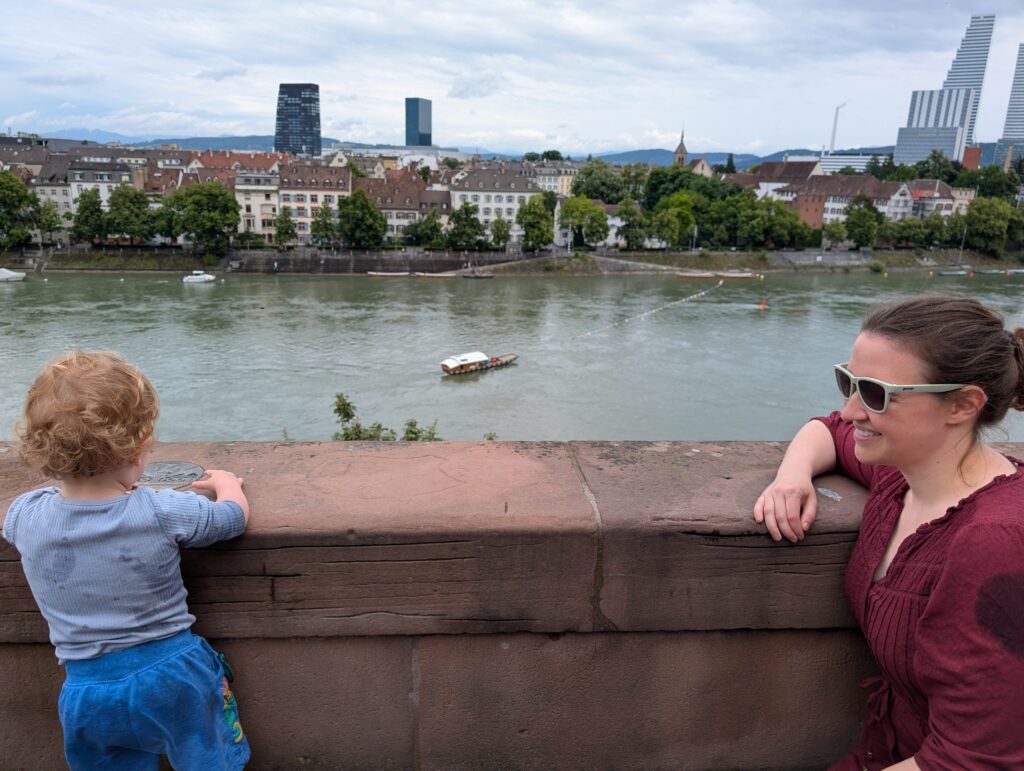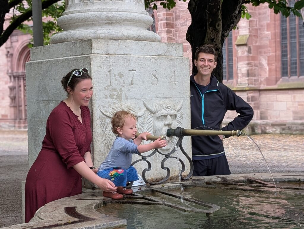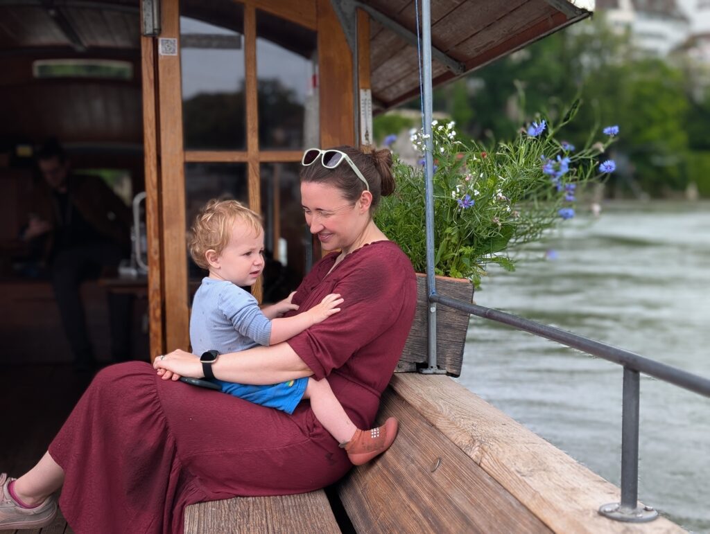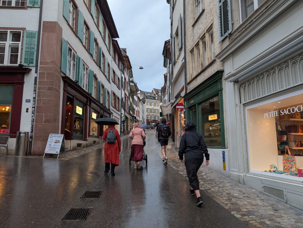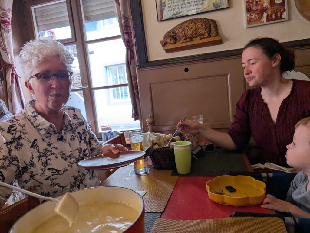 As we arrived the weather was very changeable all day. We walked from the station and were only going to grab some hot drinks and pastries and move on. A rain cloud let open as we ordered and we ended up staying in the coffee shop for about 45 minutes. Then Mark took off as he needed a running track to work out on. He had found a few on Google Maps and headed out to do his workout. The rest of us wandered over the Rhine and before we knew it, we were walking around one of the oldest parts of the city with gorgeous old buildings with huge doors. The streets were very narrow and there were beautiful public drinking fountains. We eventually ended up at the outside the Basel Minster Cathedral. This area overlooks the Rhine. Abigail knew that in Basel there were four areas where you can take a ferry across the river. These are little boats attached to a cable and by shifting a rudder the stream of the river and cable the boat moves from one side to the other. We just happened to be right above one of the ferries. I just had to get the stroller down the 200 steps from where we were. I did and we took the 2 Franc ferry across. We then found a little local restaurant that Abigail and read about called Schafeck. It is known for the pot of cheese fondue you can get, and that is exactly what we had.