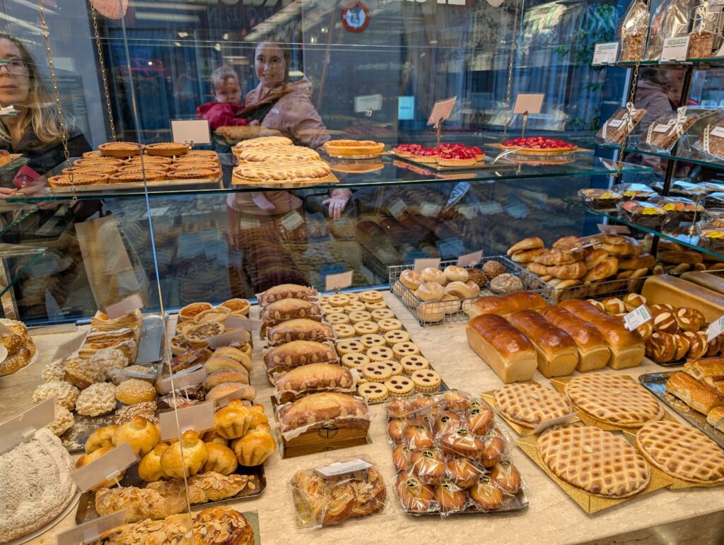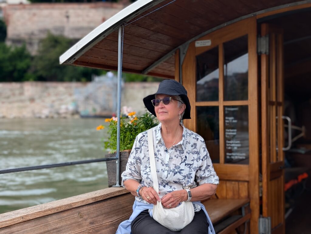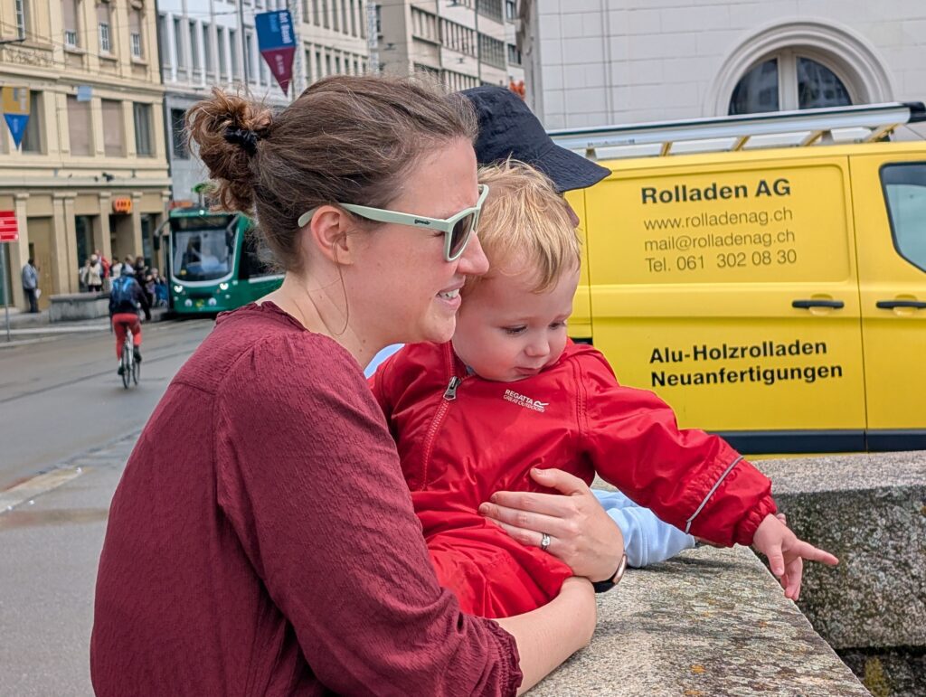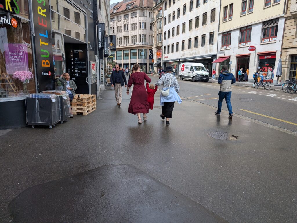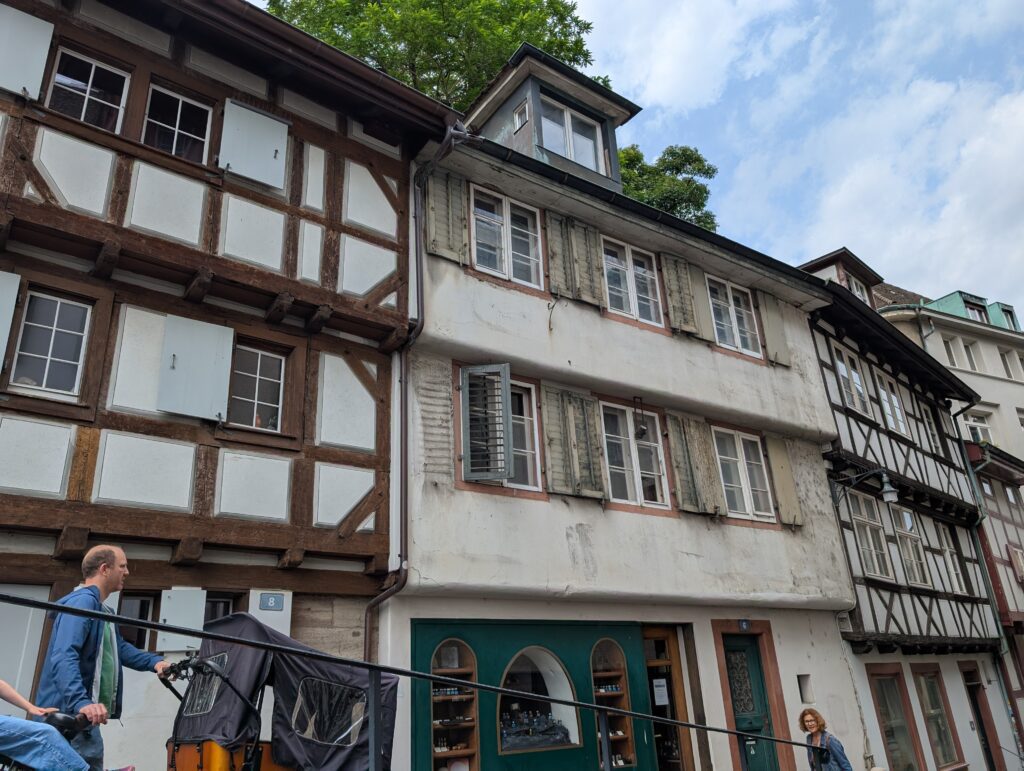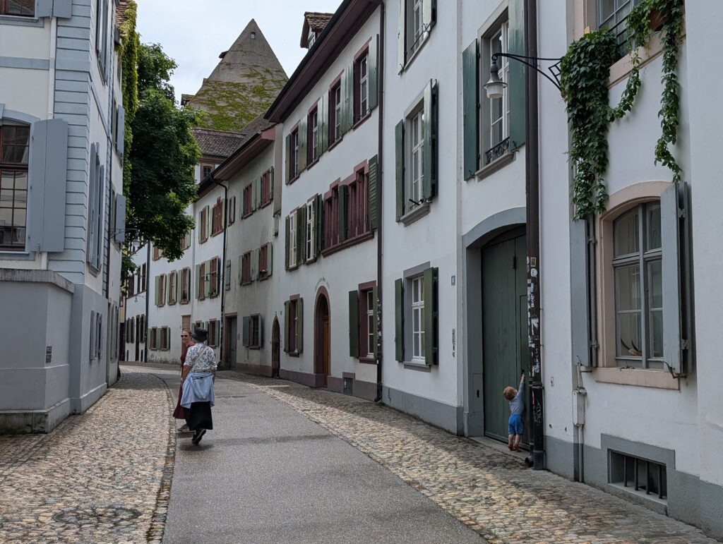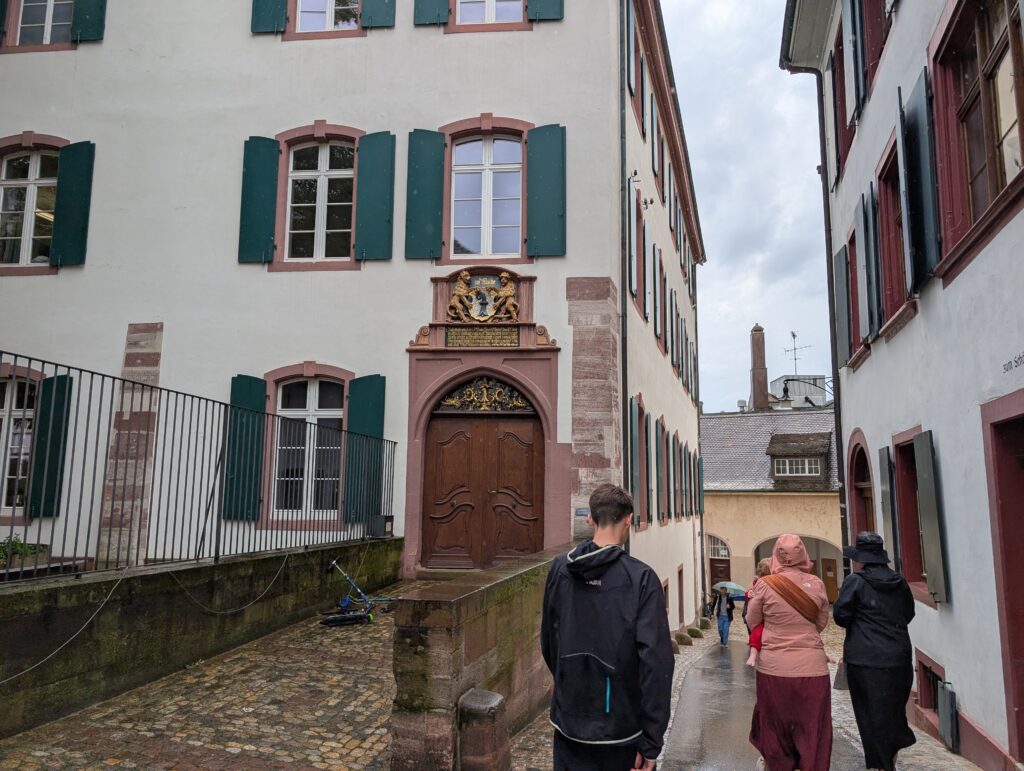 As we arrived the weather was very changeable all day. We walked from the station and were only going to grab some hot drinks and pastries and move on. A rain cloud let open as we ordered and we ended up staying in the coffee shop for about 45 minutes. Then Mark took off as he needed a running track to work out on. He had found a few on Google Maps and headed out to do his workout. The rest of us wandered over the Rhine and before we knew it, we were walking around one of the oldest parts of the city with gorgeous old buildings with huge doors. The streets were very narrow and there were beautiful public drinking fountains. We eventually ended up at the outside the Basel Minster Cathedral. This area overlooks the Rhine. Abigail knew that in Basel there were four areas where you can take a ferry across the river. These are little boats attached to a cable and by shifting a rudder the stream of the river and cable the boat moves from one side to the other. We just happened to be right above one of the ferries. I just had to get the stroller down the 200 steps from where we were. I did and we took the 2 Franc ferry across. We then found a little local restaurant that Abigail and read about called Schafeck. It is known for the pot of cheese fondue you can get, and that is exactly what we had.