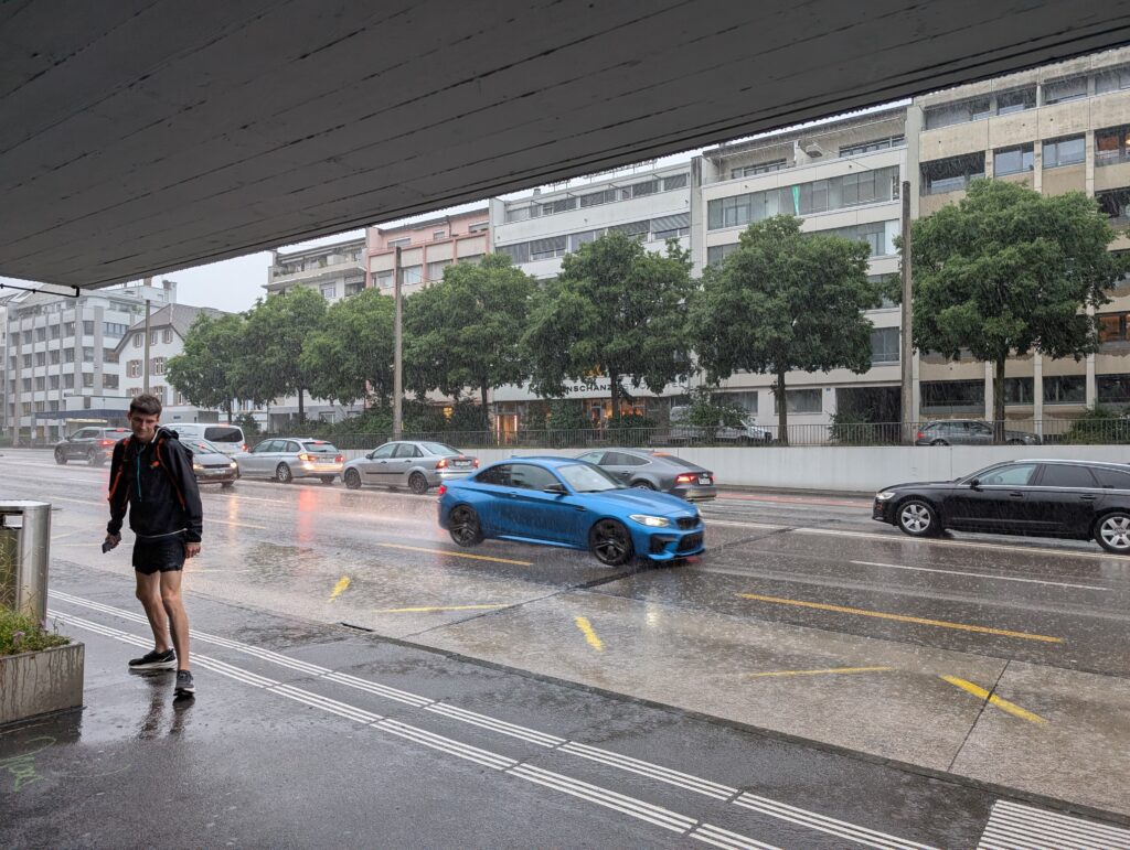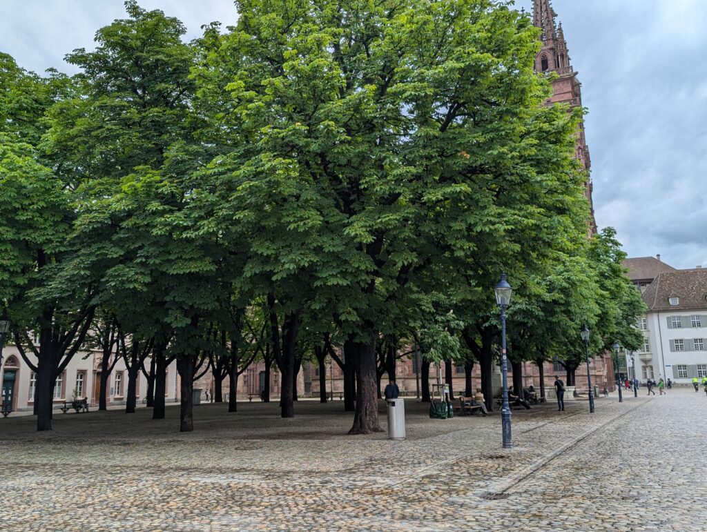 Mark met up with us at the restaurant and we all enjoyed great cheese and wine fondue. Jamie also very much enjoyed it. We all ate way too much, but it was so good, and we just kept dipping till it was gone. We then headed back out on the streets. Since Mark was not with us when we had been up at the minster, we decided to take him up to what we had seen. The rain was now coming and going very often, but we did not mind as it was not really heavy. I got a chance to run into the cathedral. It was nothing to grand, but it was originally started to be built in the 1000′ and was not really finished till the 1500’s. It also started out as a Catholic church and is now a Reformed Protestant church. Jamie had a great time playing in the little fountains that are on the side of the public water fountain. We got out of the rain under the large canopy of trees in the large square outside of the church.