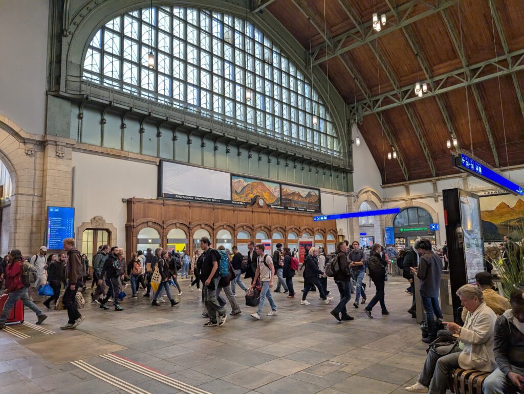 We next slowly moved down some of the gorgeous, narrow side streets. We eventually came upon a very large red brick building. Turns out it is the 500-year-old town hall. It very much dominates the area. We then found a little coffee shop for our afternoon hot drinks and pastry. Then we jumped into a Christmas shop to buy an ornament. The rain was becoming more and more frequent, and we were having to stop in stores along the way. We now started to make our way back to the train station and as we did the skies opened up on us. We were able to get into a tram stop shelter and then bought some tram tickets to get us to the station.