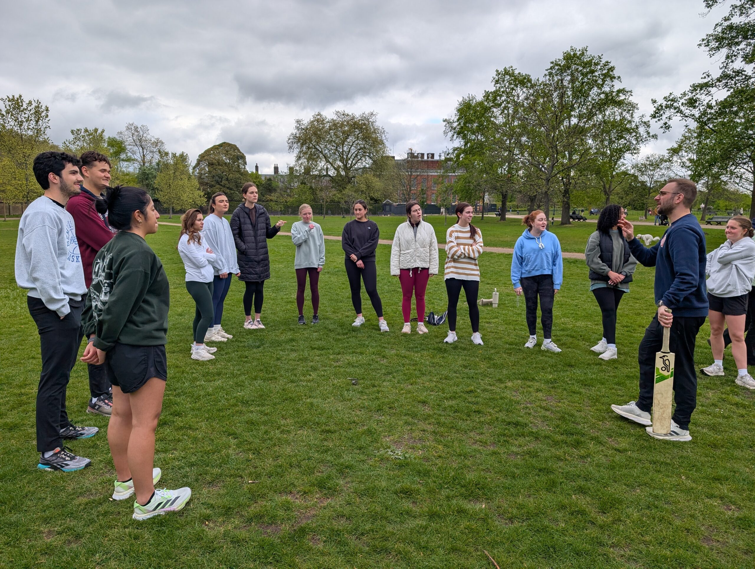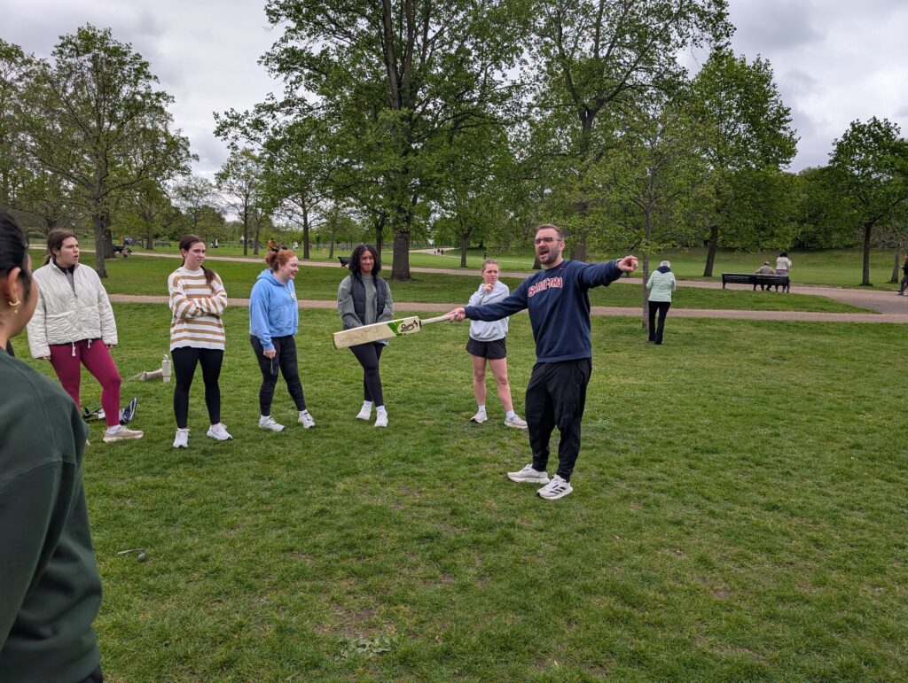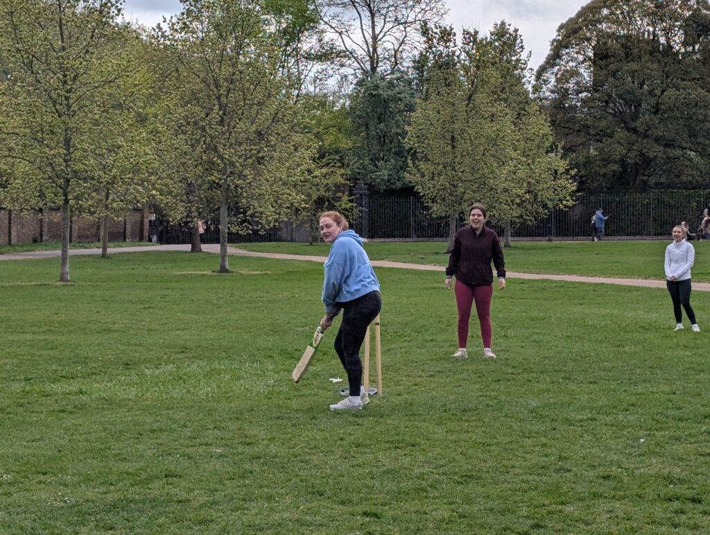 I stayed in and took care of work and other things and also stayed dry. Then later in the day, after the rain had passed the whole DH headed over to Kensington Park to learn how to play Cricket. Tom brought the equipment and explained the game, most of which none of us understood. He has done this before so he just said let’s go and you will all figure it out. Now, you have to understand that most of the people are not athletic and really didn’t care too much, but I have to give everyone credit, they all participated. The only one that did not was Becky. This was due mostly to the fact that we were afraid that insurance would not cover the injuries she most likely would incur. She sat and cheered on both teams.