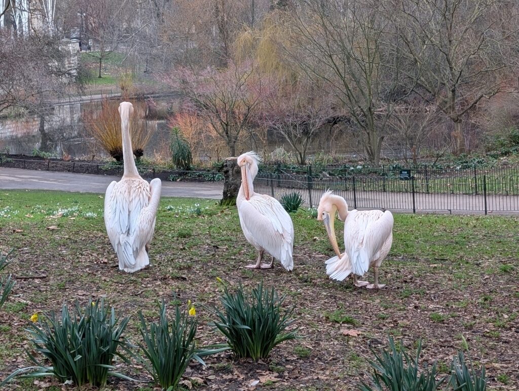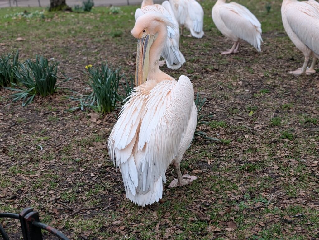 In the end, Becky and I spent almost 5 hours down in the war rooms. Afterwards we realized how close were to Buckingham Palace and so we walked over there. In St. James Park across the street from the place, we came across the pictured pelicans. Pelicans were first brought to the park in 1664 by a Russian ambassador.