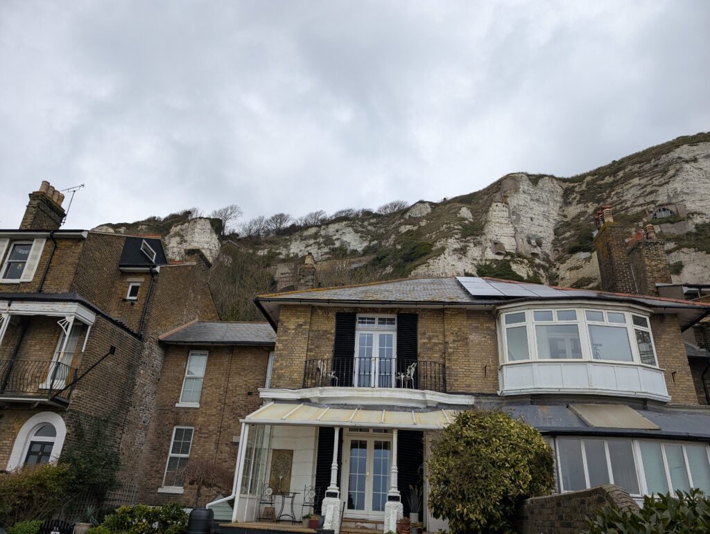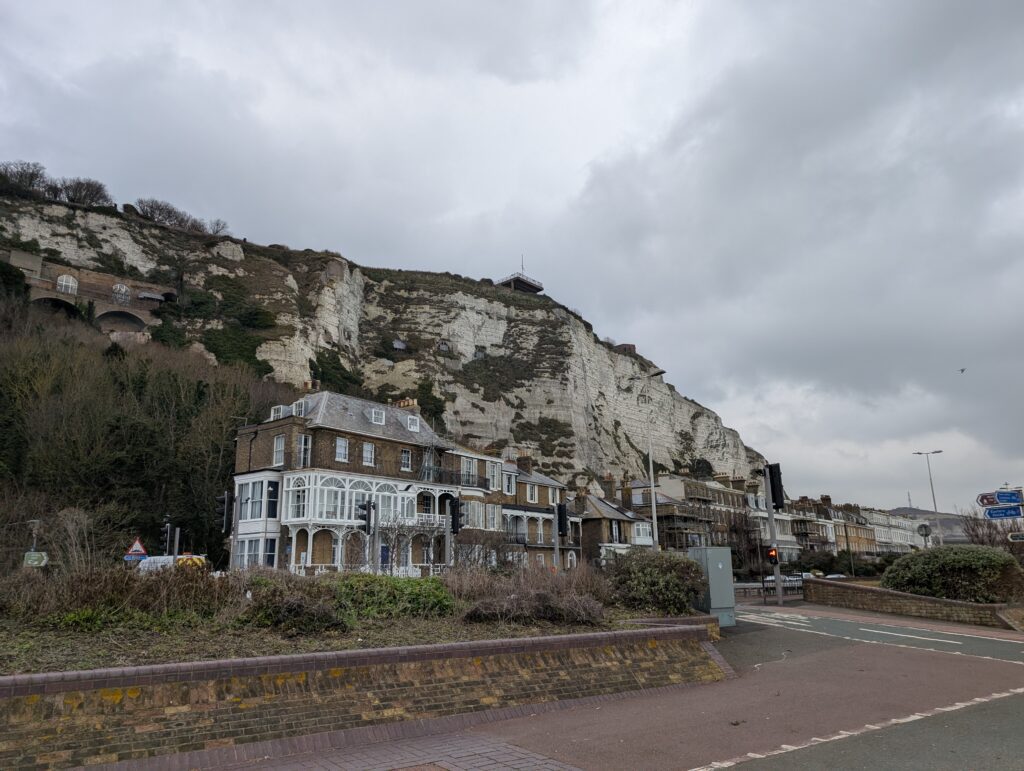 Unfortunately, after we had paid, and we saw the fine print that mentioned that we should not forget to have our passports for the trip. Well in the UK you don’t need your passport with you, so we did not have them. So, we had just paid £42 for a trip we could not take. Well, we decided we would head to the port when we arrived in Dover and see what they had to say. It was a two mile walk to the port. Did I mention it was windy, misty, and cold and now we were on the actual cost of the English Channel. We had fun though. We walked right down to the water and long the harbor. We saw the White Cliffs and the houses along the waterfront were amazing. It was cold and windy and misty.