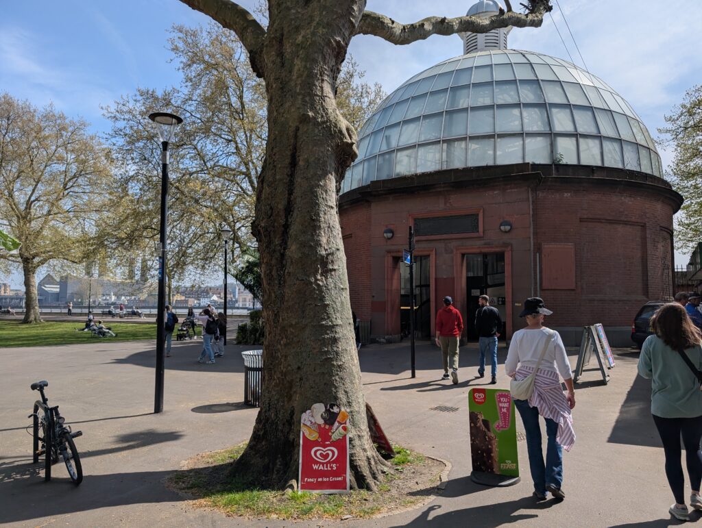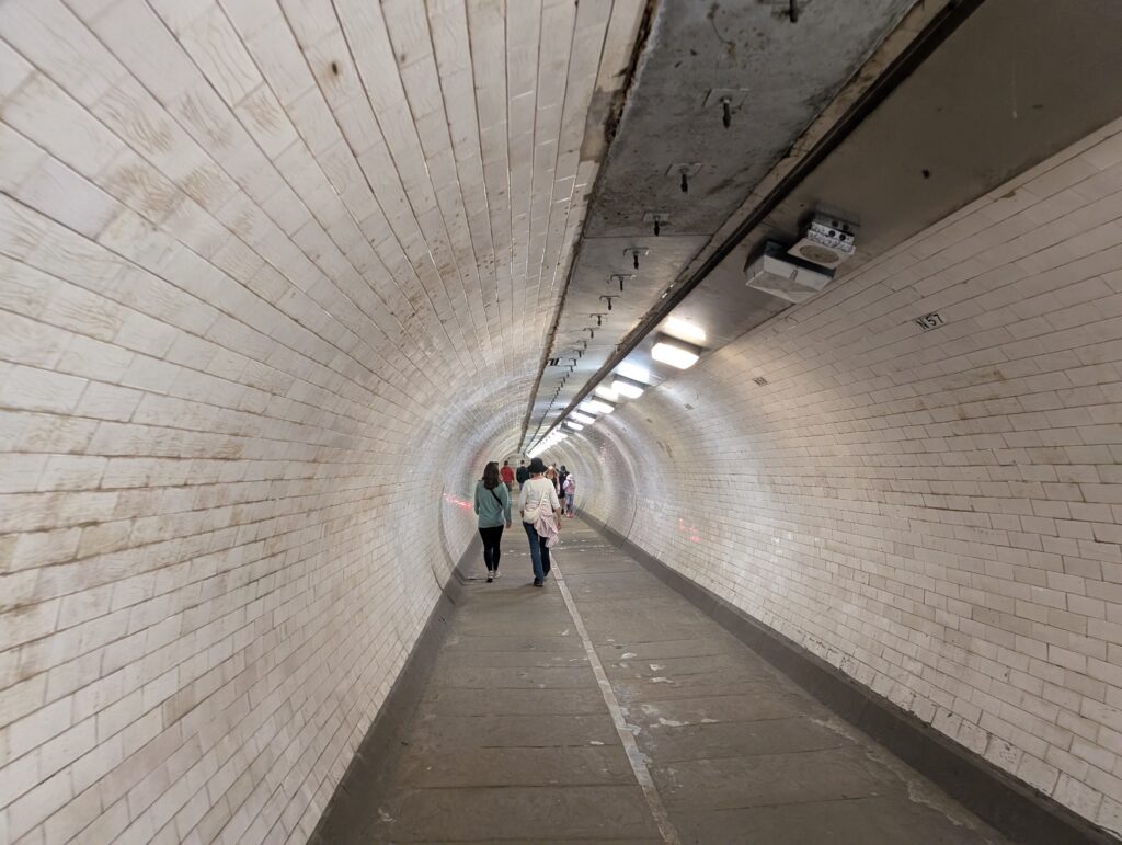 They place was fairly busy due to the perfect weather, but we had an enjoyable time walking around and seeing the animals. We then sat out a picnic table and had a nice long lunch and visit. We then headed to the Greenwich Pedestrian Tunnel. This tunnel goes under the Thames and was opened in 1902. It was hit by a bomb in the blitz during WWII, but they were able to repair it fairly quickly. They had to as if it had been left open it would have caused all sorts of problems in the river. They say that around 4,000 people use the tunnel every day to go from East London on one side to the Millwall area on the other side. It is strange walking it realizing you are under the Thames.