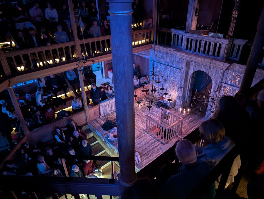 This day was not done, and neither was the walking. The students in the Arts class were all going to see The Three Sisters at the Globe Theatre. We also got tickets to join them. We left the Mayflower and typed in our CityMapper app that we need to get to The Globe. We got on the train and arrived right on time, unfortunately it was the Globe pub. The theatre was on the other side of the river and a 20-minute walk or 35-minute train trip. We booked it and made it with 4 minutes to spare. Turned out our seats were at the very top of the upper level and were standing room.