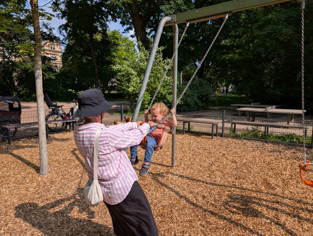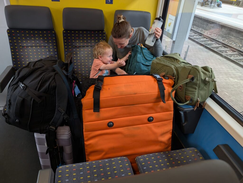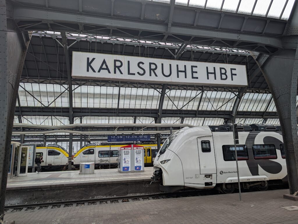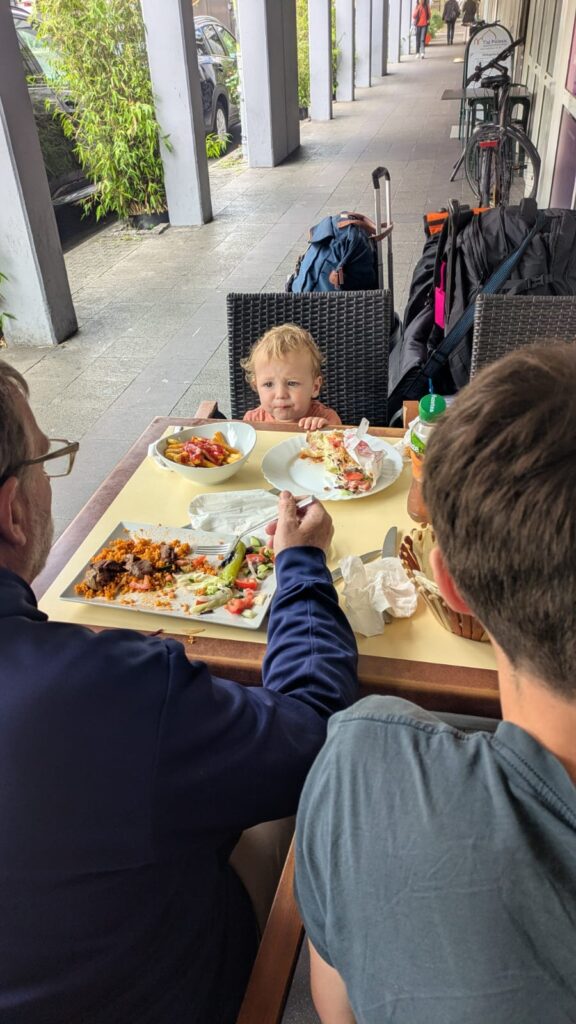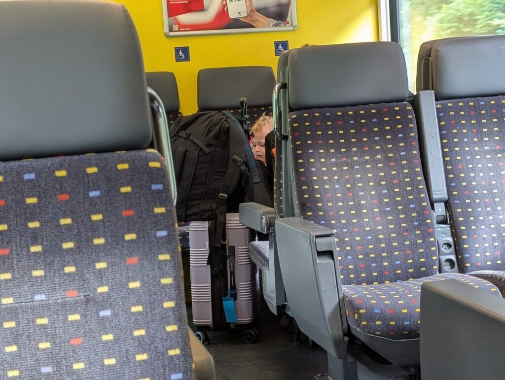 We awoke to a cool morning, only in the mid 50’s and breezy. We spent the morning sorting through our stuff and packing up. Our hotel rooms were more than just a room. Each one came with a kitchenette, and we did have some large windows we could open. Ours were helpful as we came back with some wet clothes that we needed to air out overnight. Abigail wanted to get a run in and Mark needed to work after his morning run. Becky and I played with Jamie at the park for a bit while she ran. Mark would be staying in Karlsruhe for the next couple of days before he traveled off to his next race. We did not need to check out till noon, and then we made our way down the street a bit and got some Mediterranean food for lunch. Then we said goodby to Mark and we got a tram that took us to the train station.