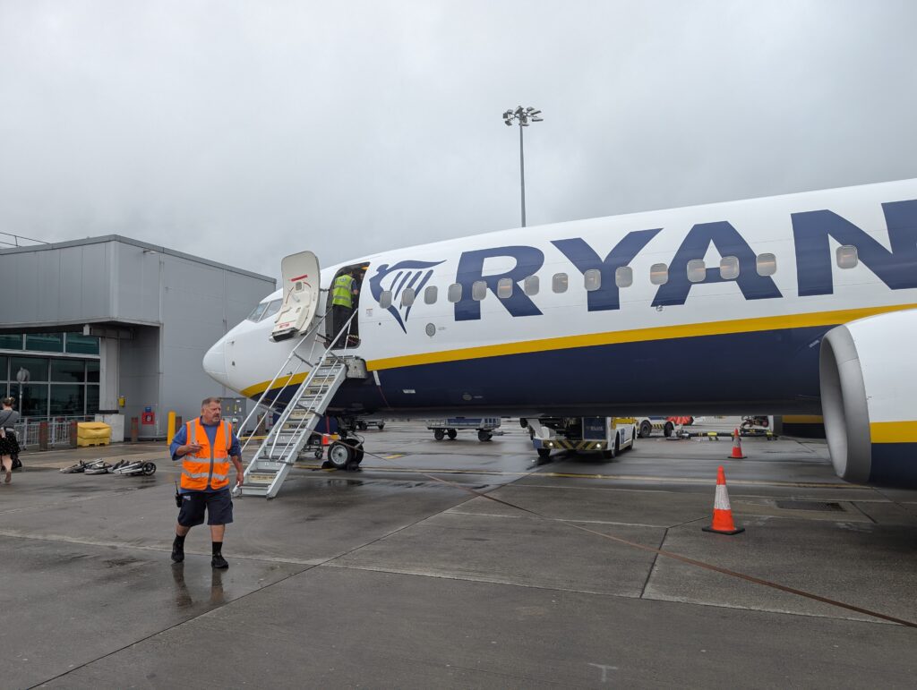 We rode a train down the line twenty minutes to Baden-Baden Germany. From there we were going to take a bus to the airport, but there was no bus to be found, and we needed to get to the airport. We just hired a taxi and rode there. We had to check the stroller, which was no problem, but security was a long, almost 45-minute wait. We eventually made it through security and customs and then waited for our next Ryan Air experience. They have priority boarding for people with small children, but in reality, half the plane was considered priority for one reason or another. We first had to wait on a bus to be taken to the plane. Jamie soiled his diaper while on the bus and so Abigail did an amazing job of just changing him right on the tarmac before we boarded.
