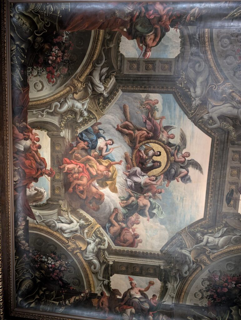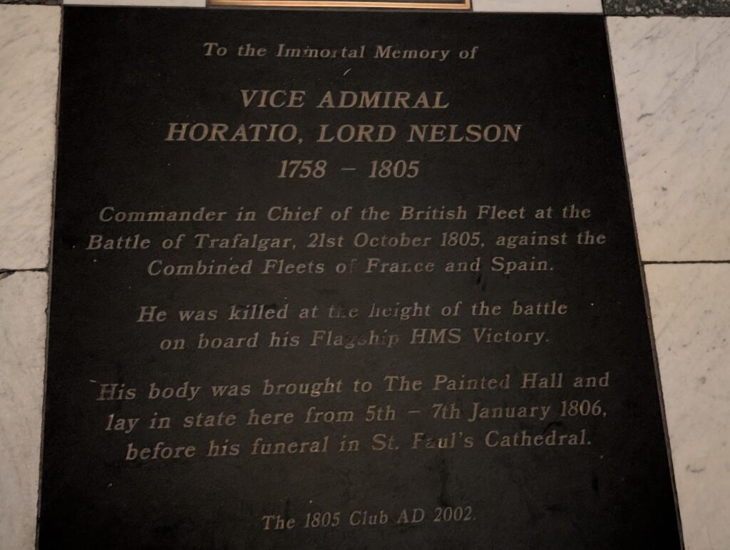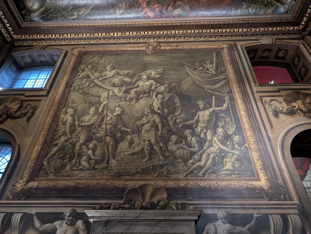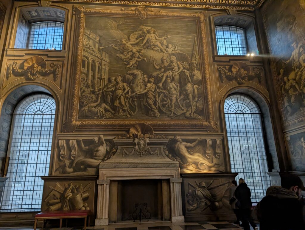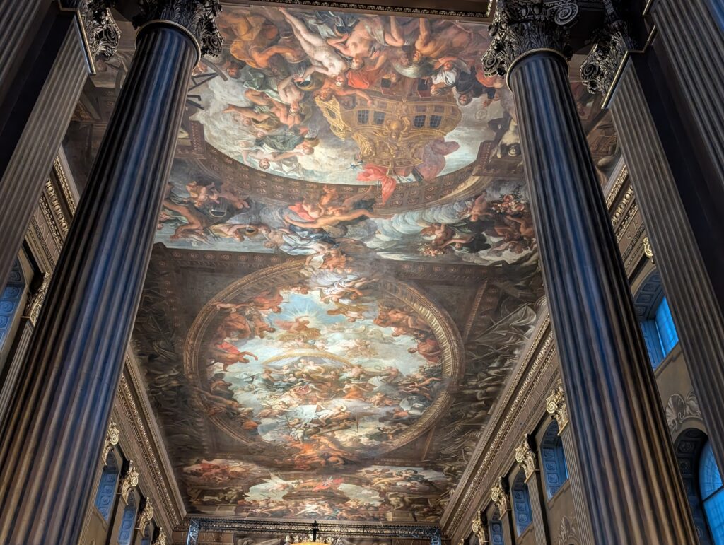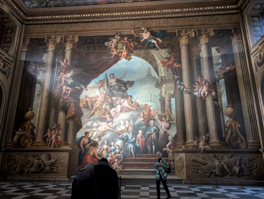 After a couple of hours, the students scattered for internships or to head off to explorer London. Becky and I first participated in a great talk on navigation with time and how we got there. We then had lunch at a pub and finally went to the Old Royal Navy College. The area has been used and left to decay and rebuilt a couple of times. Currently it is actually used as part of the Navy college and other parts are used as museums. One building we heard about and were told to make sure we saw was the Painted Hall. It truly lived up to its billing. The building was gorgeous and the tour we took gave such great history. For anyone who is a Lord Nelson buff, this is the place to go. The Painted Hall is referred to as the Sistine Chapel of England.