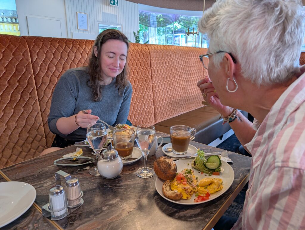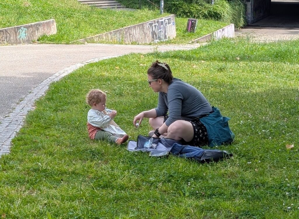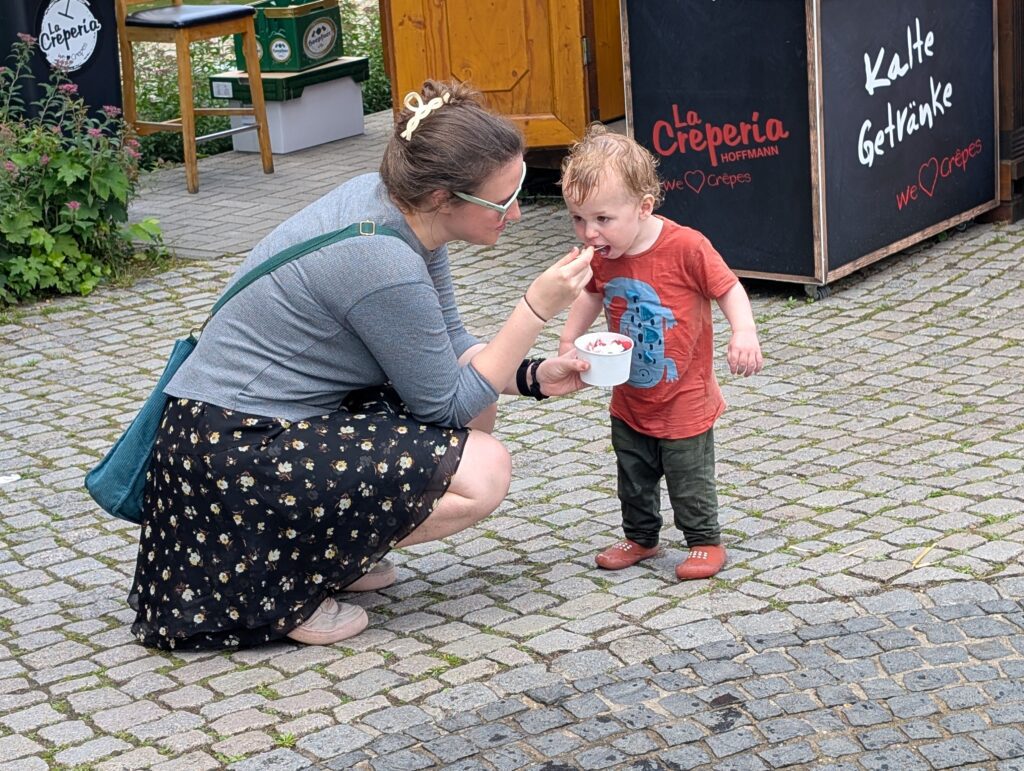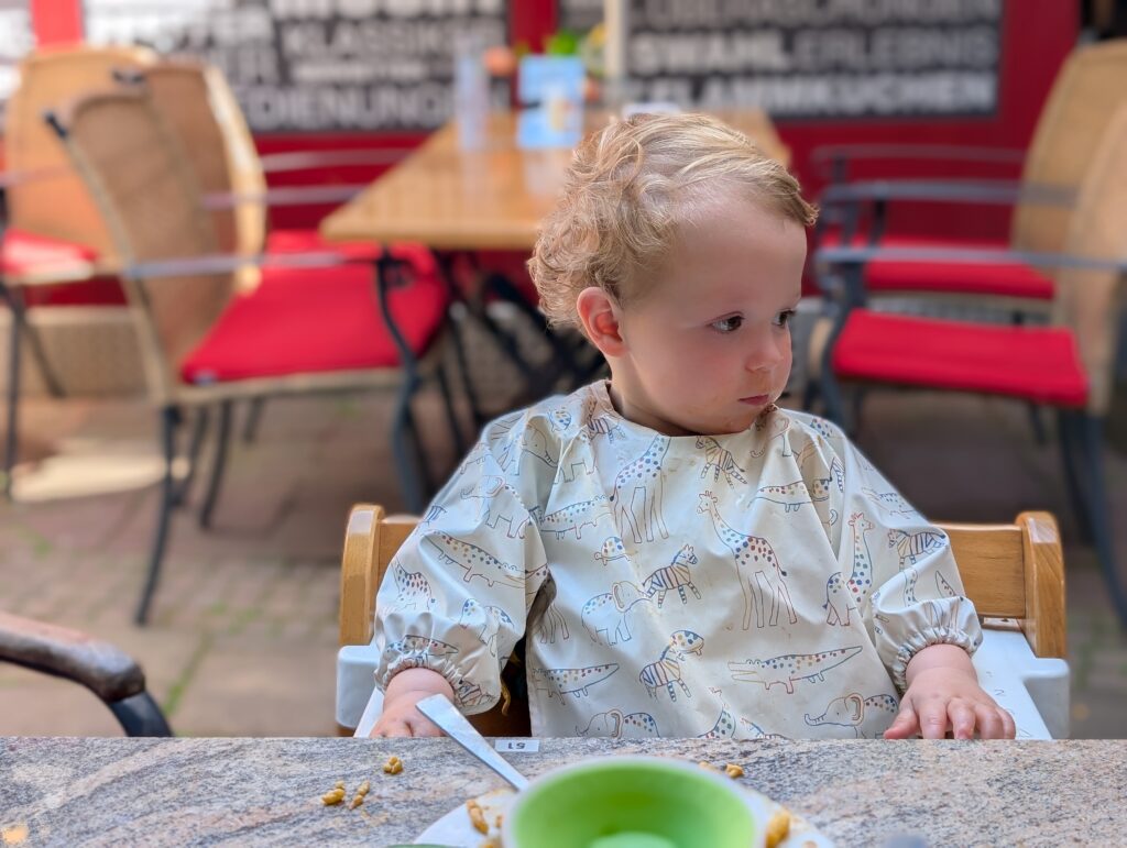 In Germany on Sunday, they have Shop Closing Laws. This means that almost everything is closed, even many restaurants and coffee shops. This was also a problem as Jamie needed diapers. We did find a place to have a nice breakfast and then we started looking for diapers and only came across an apothecary that had adult diapers. We did find a woman coming out an apartment with children near Jamie’s age and since Mark speaks German, he was able to ask her, and she kindly gave us several for the day.
