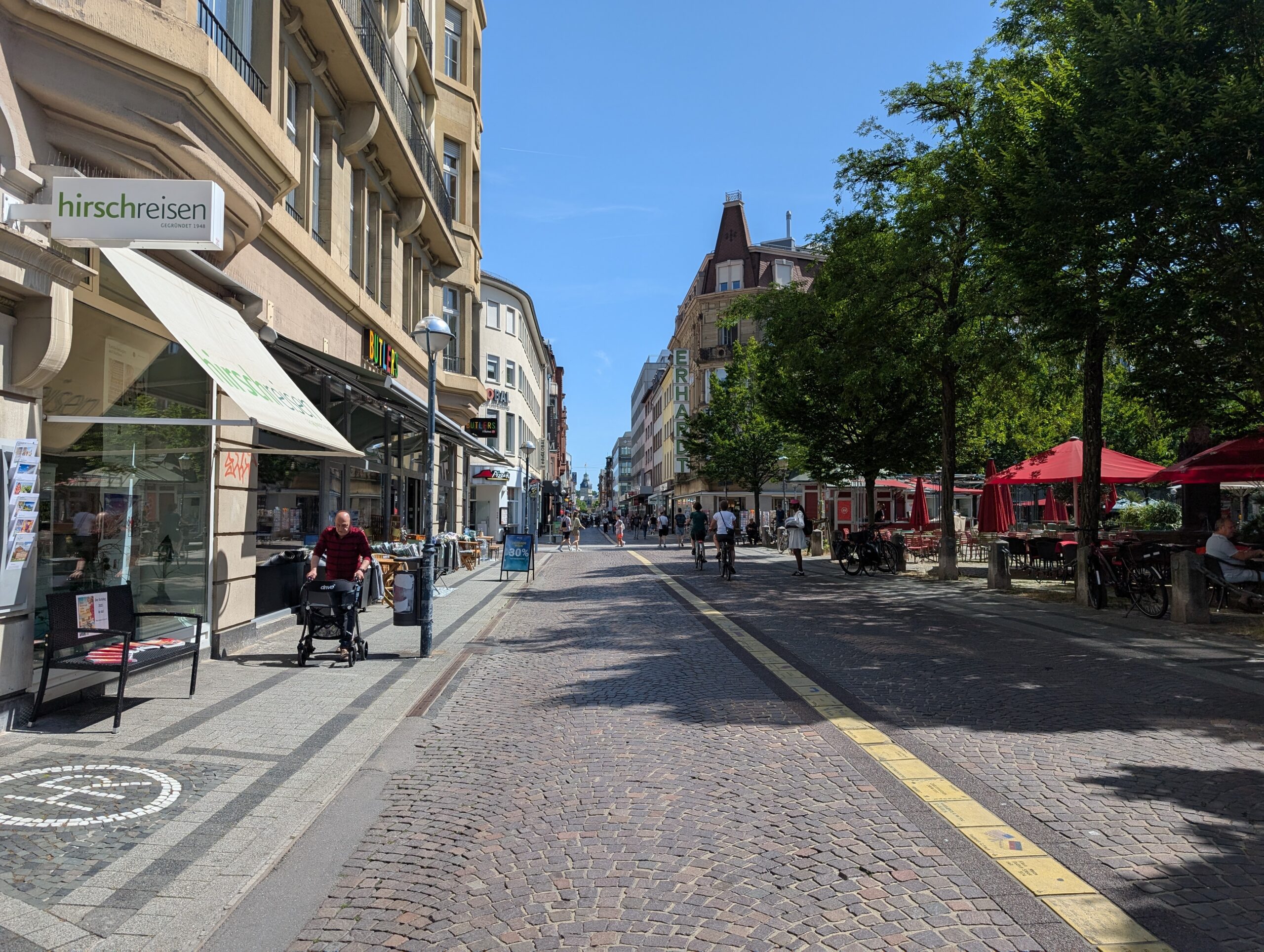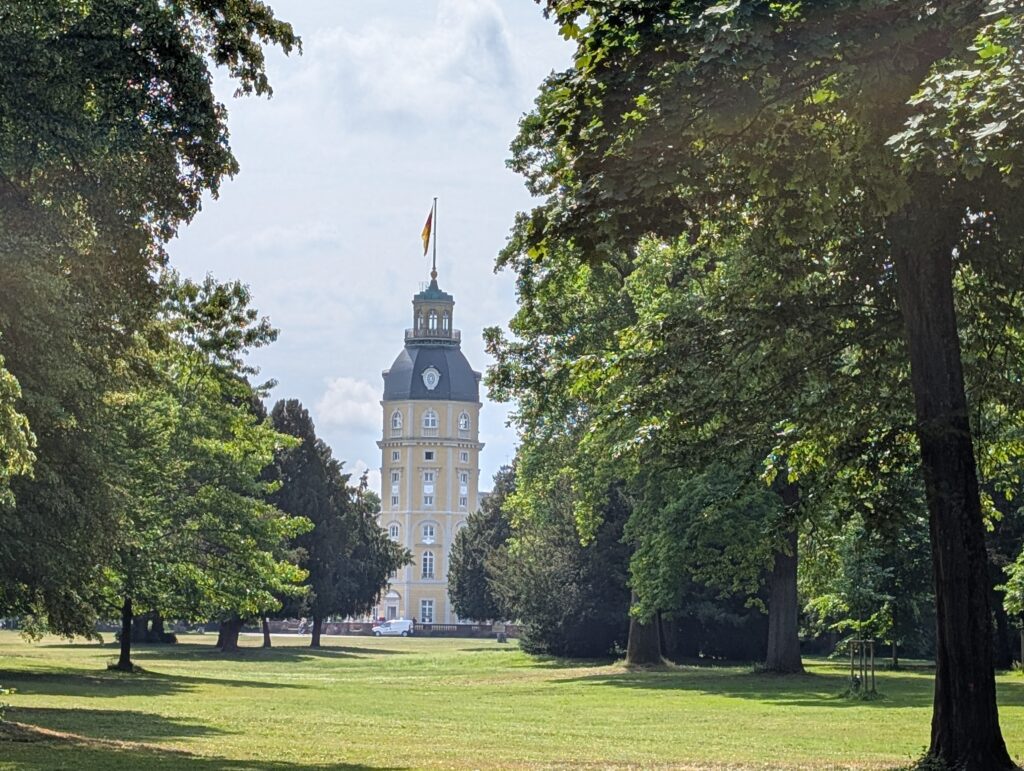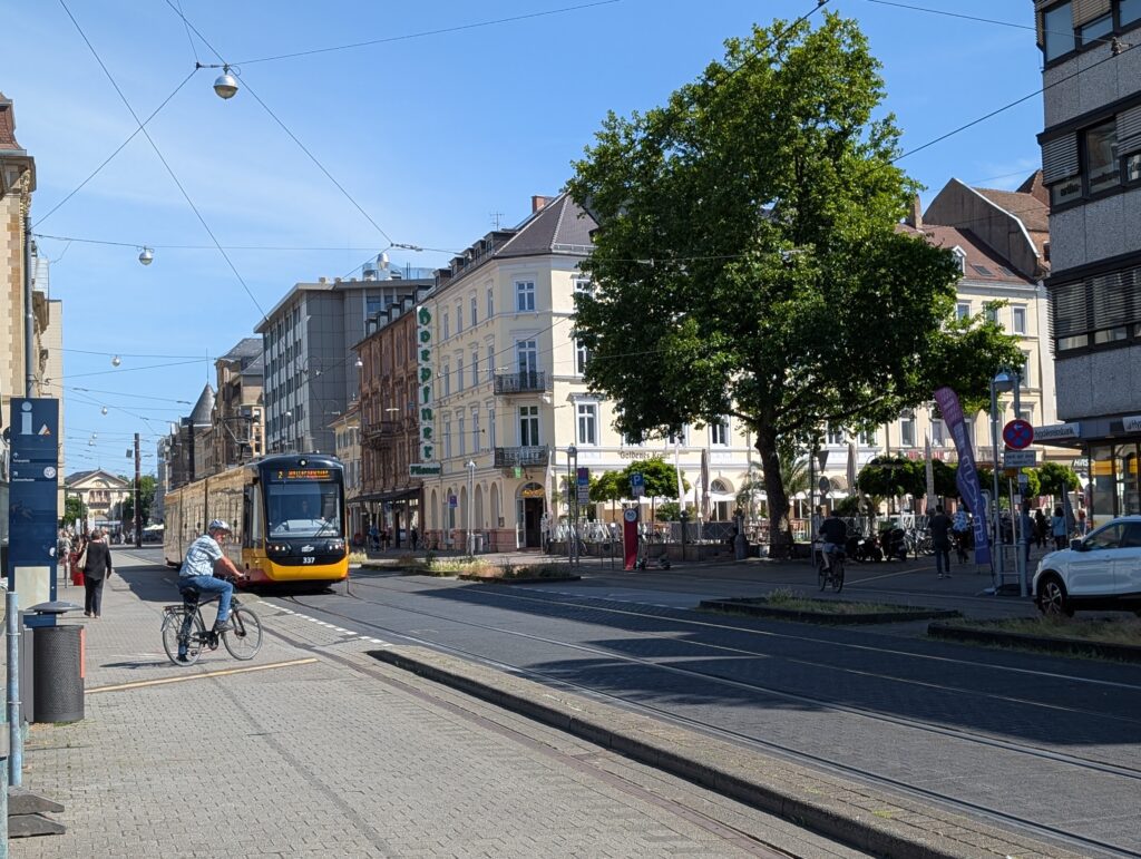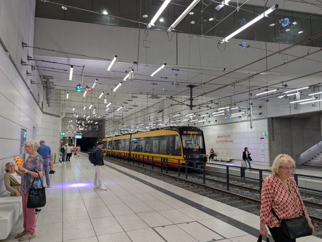 It was a Saturday, and they street were bustling. Bicycles are everywhere in the city. People of all ages ride them, and they come in every size and shape you can believe. You really have to watch out for them as they will come up on you from every direction. Karlsruhe is not a very old city as European cities go. It was founded in the late 1700’s and has a unique feature that there are 32 streets that fan out from the palace. There are many streets crossing other streets at strange angles. The city was heavily bombed during WW2 and thus many of the buildings are post 1950. There are older buildings that survived the bombings and so there is still an old German city feel to certain streets and areas that we moved through.