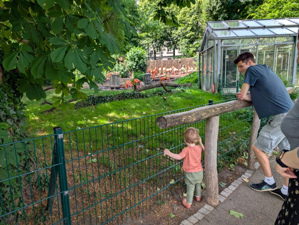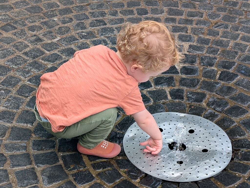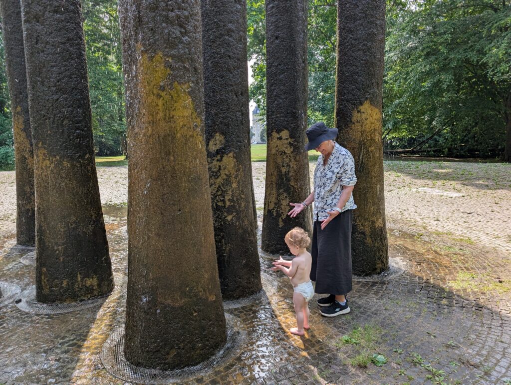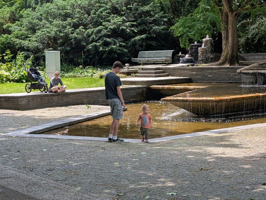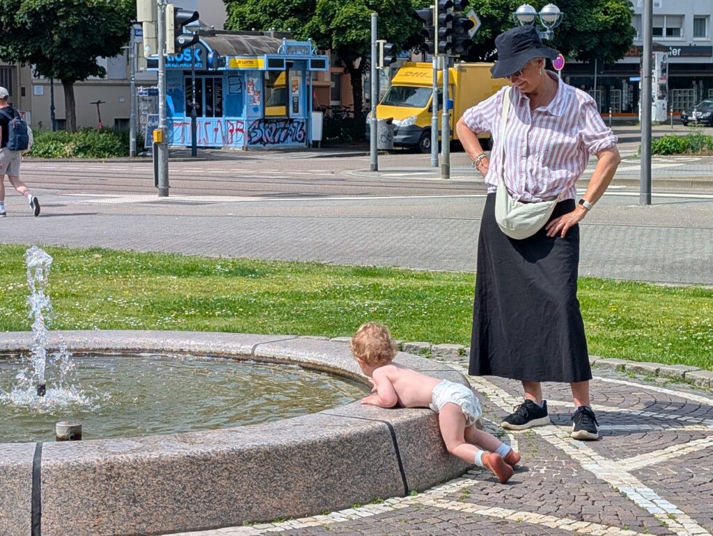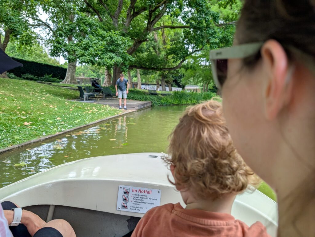 We then headed to the Karlsruhe Zoo. It was another hot day, but about 10 degrees cooler than the day before. We eventually rode some well-designed boats in the little zoo lake. The boats are on a track under the water, and you just get in and it takes you around. Jamie really enjoyed it. We then grabbed something to eat and there was a nearby splash pad that Jamie wandered into. Soon, he was very wet and very happy. He had a great time, and the other kids loved playing with him. After some food, some dry clothes, a little walk over to the rose garden he was asleep in the stroller. Becky and I each took off and wandered around the park and relaxed. Mark had to do a training run for next week ends race. Abigail just sat in the shade and kept an eye on the sleeping child. We finally woke him up and headed out. We ended the day by meeting up with Mark at a nice restaurant near the hotel and had a nice dinner outside. Jamie made friends with all the people around us. It was a good day.