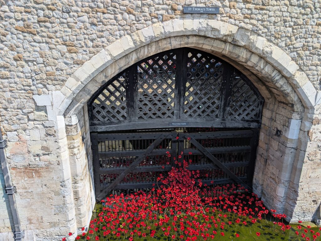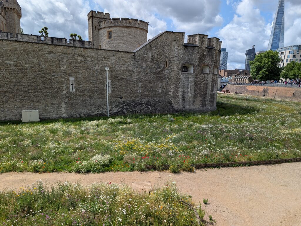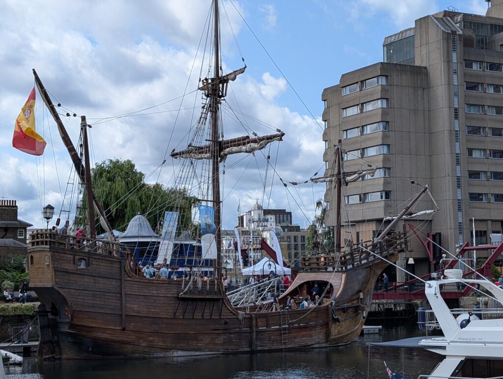 We rode the tube to the Tower Hill station and got off. Becky had heard that they had put out poppies around the tower again. Turned out they are only being displayed inside, and we were not going to pay to go inside. We walked around the outside and the moat area around the castle is being turned into a walkway and there are many wildflowers growing in it, and it is gorgeous. We then walked over to St. Katherines’ Dock area to see the replica of Christopher Columbus’ boat the Nao Santa Maria. We wanted to tour it, but they were only accepting cash payments due to a technical problem. It was still impressive to see the boat.