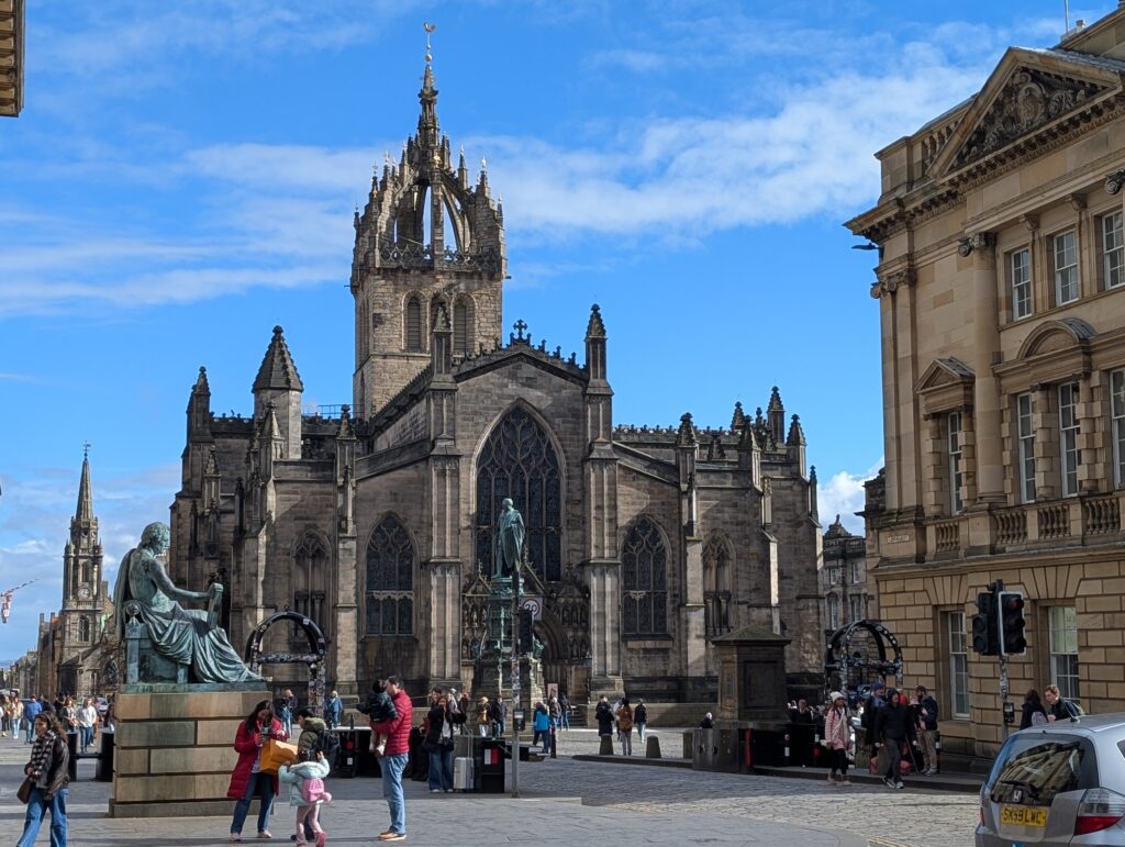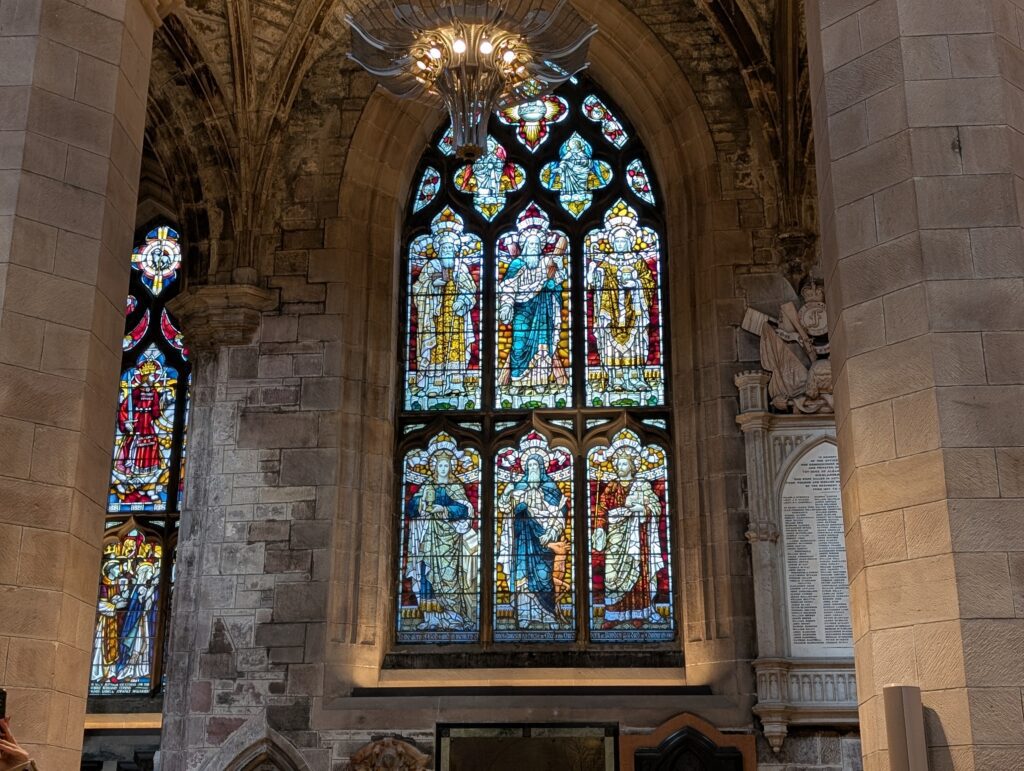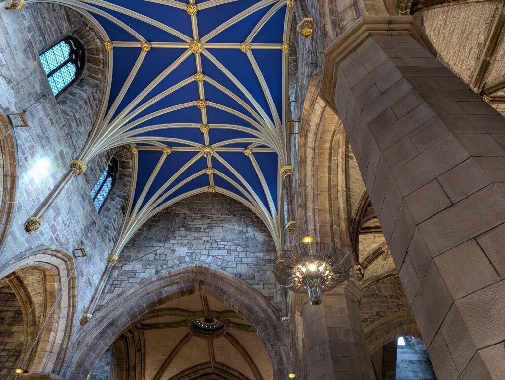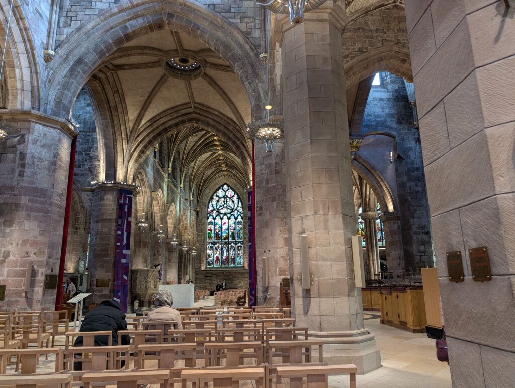 Our first full day in Scotland was gorgeous. It was a bit cold, but not icy. We got our morning hot drinks and together we went up the Royal Mile. We did some browsing in sweater and scarf shops. We eventually made it to St. Giles church and decided to go in and check it out. Just as we walked in and was going to ask what it would cost to come in, a woman volunteer pulled us into a 1-hour tour she was starting and said it was free. We joined. Turns out this church building has a ton of Scottish history surrounding it. It was the central point of the protestant reformation and is the church that John Knox ministered at. The building has held the Scottish Parliament, been a prison, and has seen executions just outside its doors. It has had all of its religious icons removed and now slowly many have been restored. It also had a special chapel added to it in 1911 to house the Order of the Thistle, that seems to date back to the 1600’s. It was a great tour and added so much Scottish history to our knowledge base.