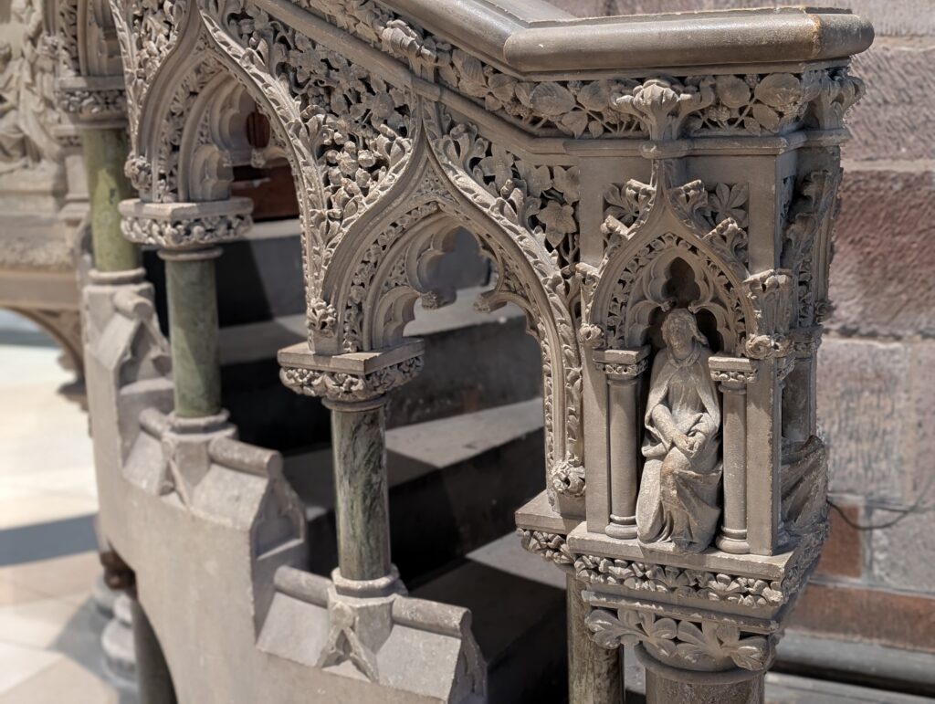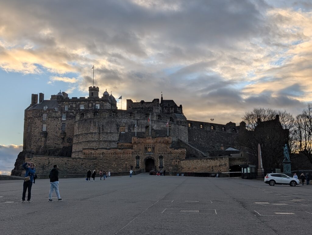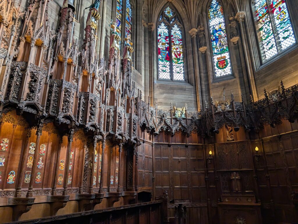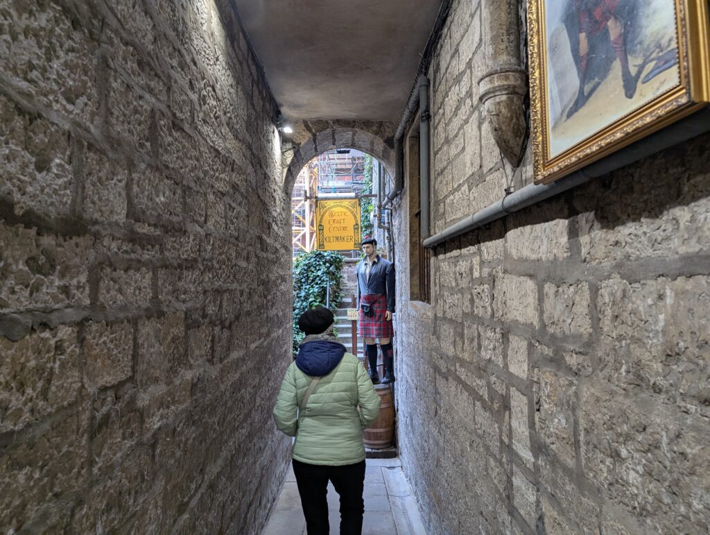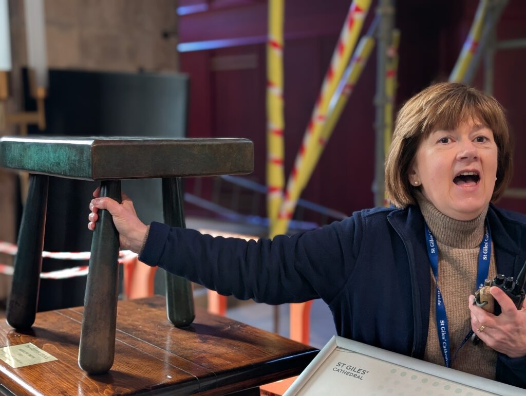 Our first full day in Scotland was gorgeous. It was a bit cold, but not icy. We got our morning hot drinks and together we went up the Royal Mile. We did some browsing in sweater and scarf shops. We eventually made it to St. Giles church and decided to go in and check it out. Just as we walked in and was going to ask what it would cost to come in, a woman volunteer pulled us into a 1-hour tour she was starting and said it was free. We joined. Turns out this church building has a ton of Scottish history surrounding it. It was the central point of the protestant reformation and is the church that John Knox ministered at. The building has held the Scottish Parliament, been a prison, and has seen executions just outside its doors. It has had all of its religious icons removed and now slowly many have been restored. It also had a special chapel added to it in 1911 to house the Order of the Thistle, that seems to date back to the 1600’s. It was a great tour and added so much Scottish history to our knowledge base.