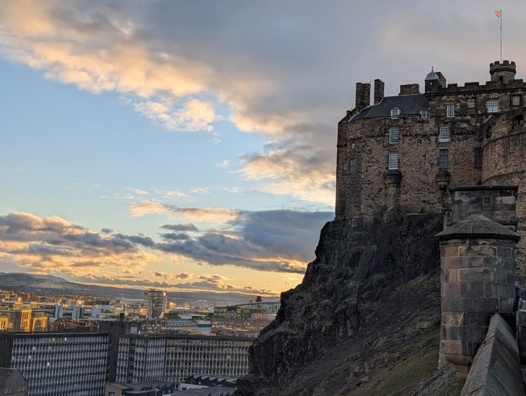 There is the main road through Edinburgh called the Royal Mile. It is not exactly a mile but is the main street that goes from one end, where the Edinburgh castle is built high above the city on top of an extinct volcano, and at the other end of the mile is the Holyrood Palace which is the current royal residence in Scotland. In between both of these is a street lined with many, many buildings from hundreds of years, each building from a different time period. There was even a wonderful Scotsman playing the bagpipes. It was a nice walk with some amazing views as the sunset. I then picked up some food and we ate in and watched more “Wolf Hall”.