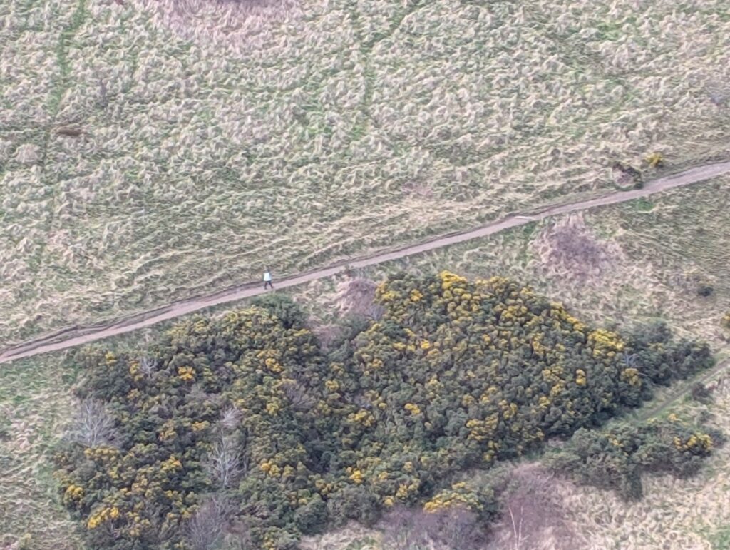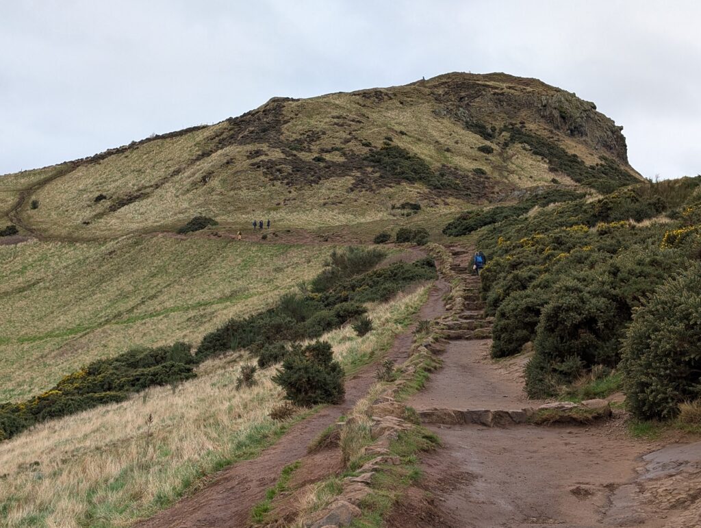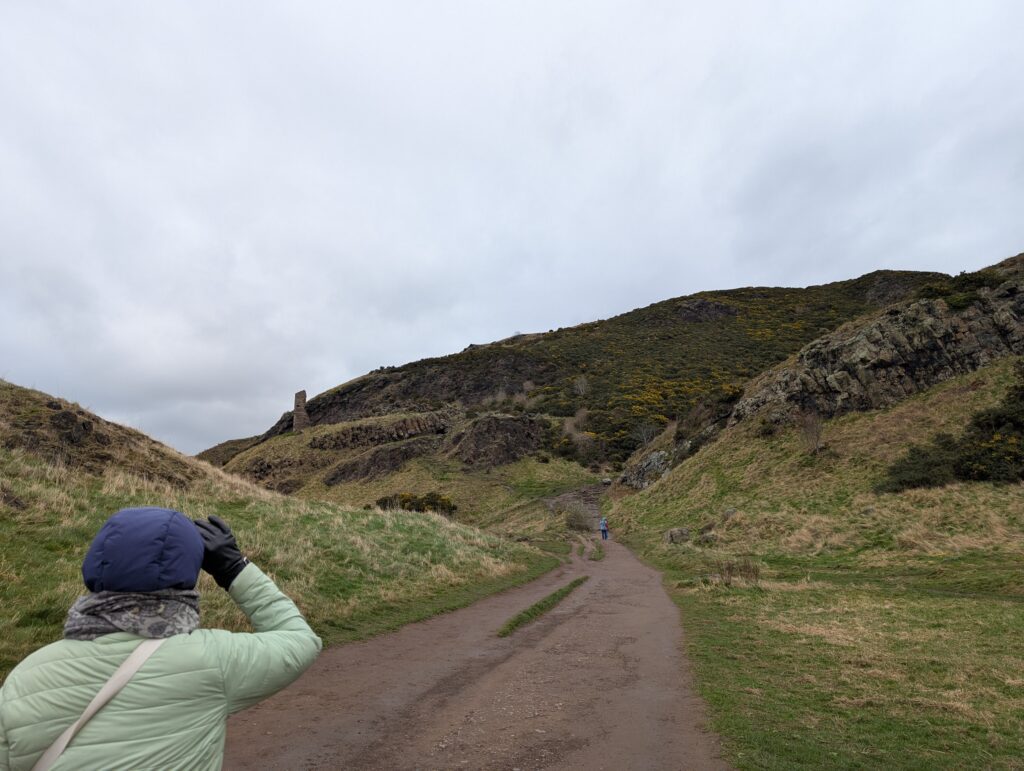 We then walked to the castle and then worked our way back down the mile to the Palace. Along the way we stopped to have some BBQ pork, and it was not bad at all. The other significant place by the Holyrood Palace is the Holyrood Park that has at the top of its mountain King Arthurs seat. It is the site of an ancient volcano and currently has nothing built on it. Through the ages there are many stories of building and how it was used as defense in battles. Now it just provides glorious views of the Edinburgh landscape all the way out to the North Sea Bay. Becky was not able to climb all the way to the top, again due to her ankle, but she was able to make very high up and enjoy many views. I was able to get to the top. Just by chance I looked way down from the top along a path and thought I saw this little green jacketed spot and so I called her. Amazingly it was her and we each got a picture of the other again.