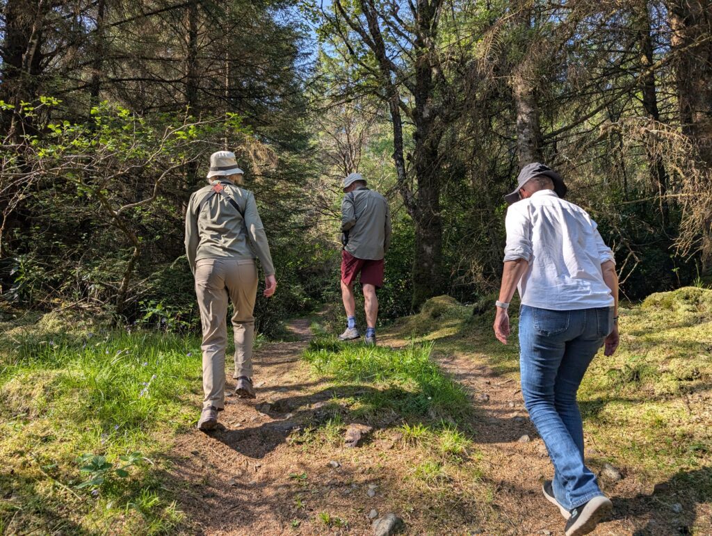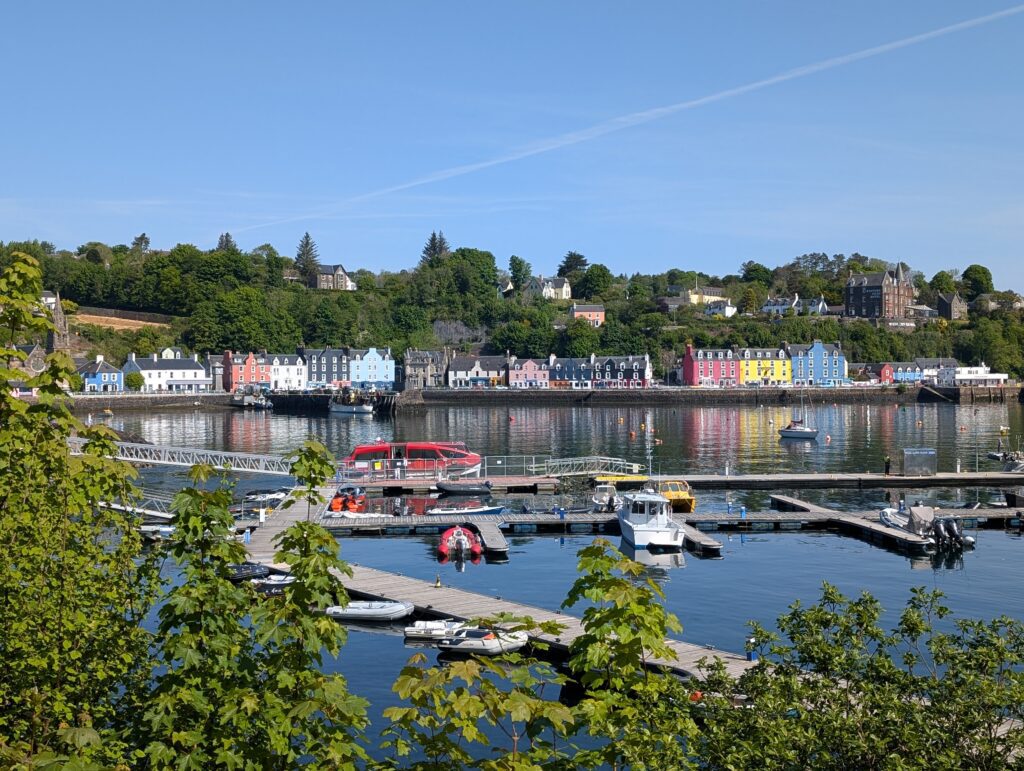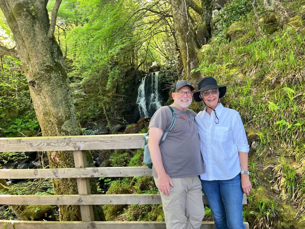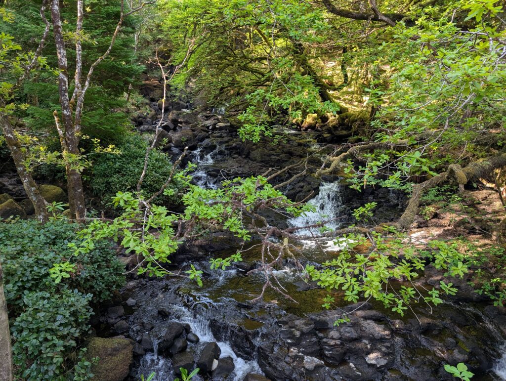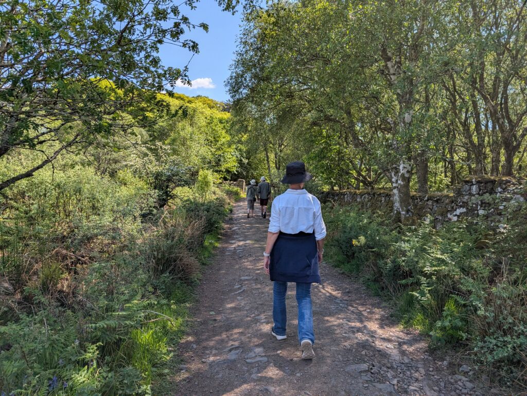 The next morning, we had breakfast and then took a suggested hike along the bay through some woods and to a small waterfall that ran into the bay. There were many different types of boats in the bay from little dinghies to a full cruise ship. After our hike we checked out and loaded up to drive through the Isle of Mull and take a couple more ferries and get to Iona.