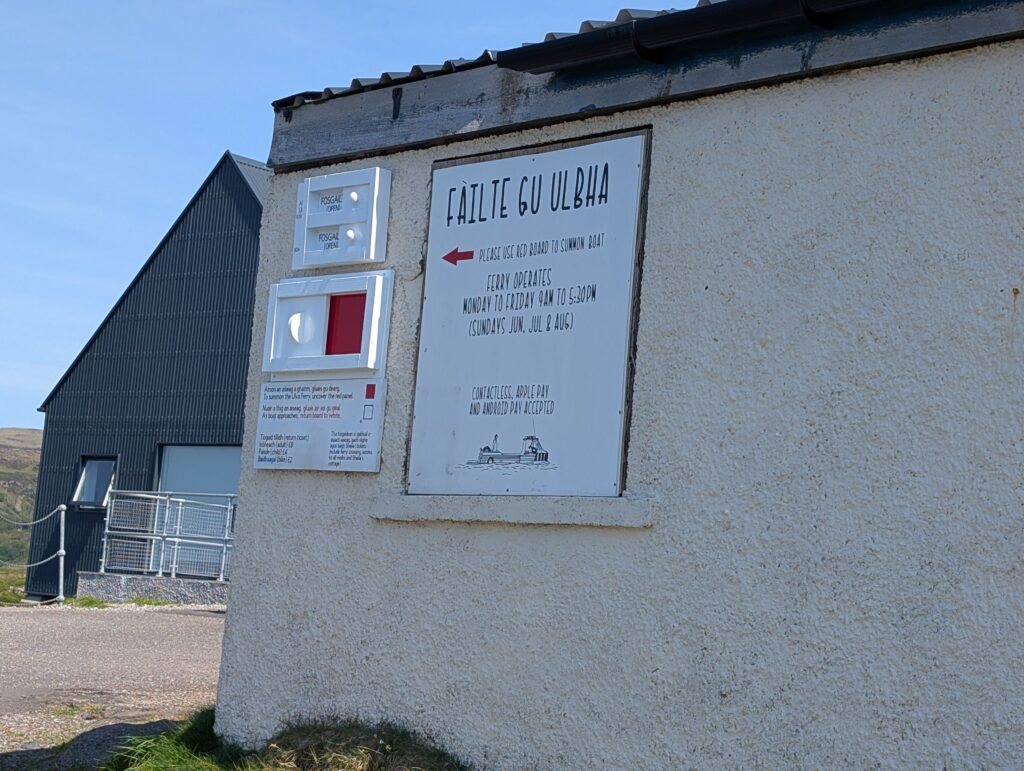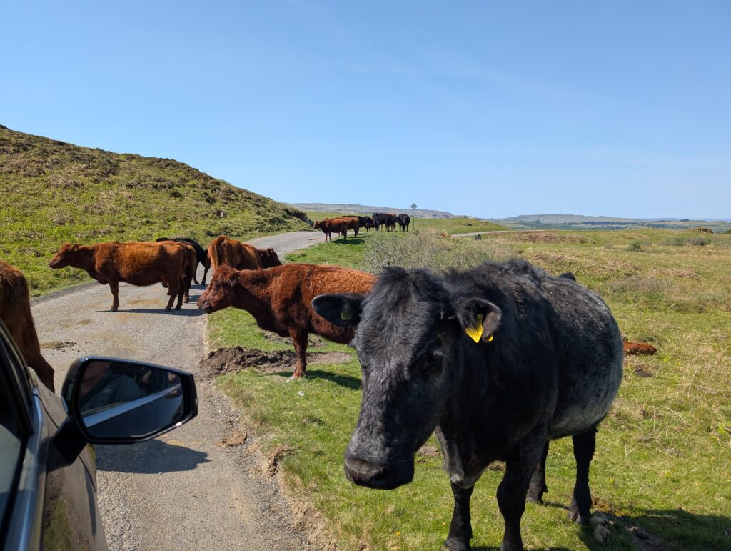 We drove along mostly one lane roads. These narrow roads are shared by everyone, including when we came across a herd of cattle that wanted to share the road with us. As we drove along this route the views seemed to just expand. With each curve of the road there seemed to be bigger and bigger expanses of land spilling out before us. Open spaces, hills, lochs, and sheep grazing everywhere. Eventually we arrived at the Isle of Ulva ferry.