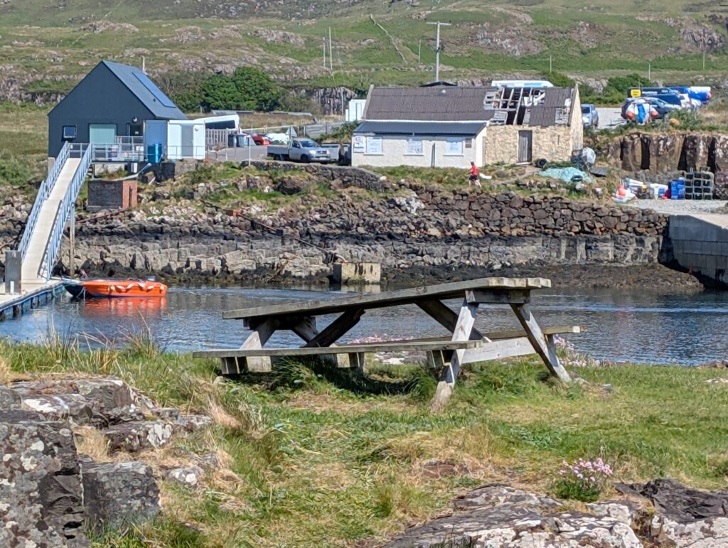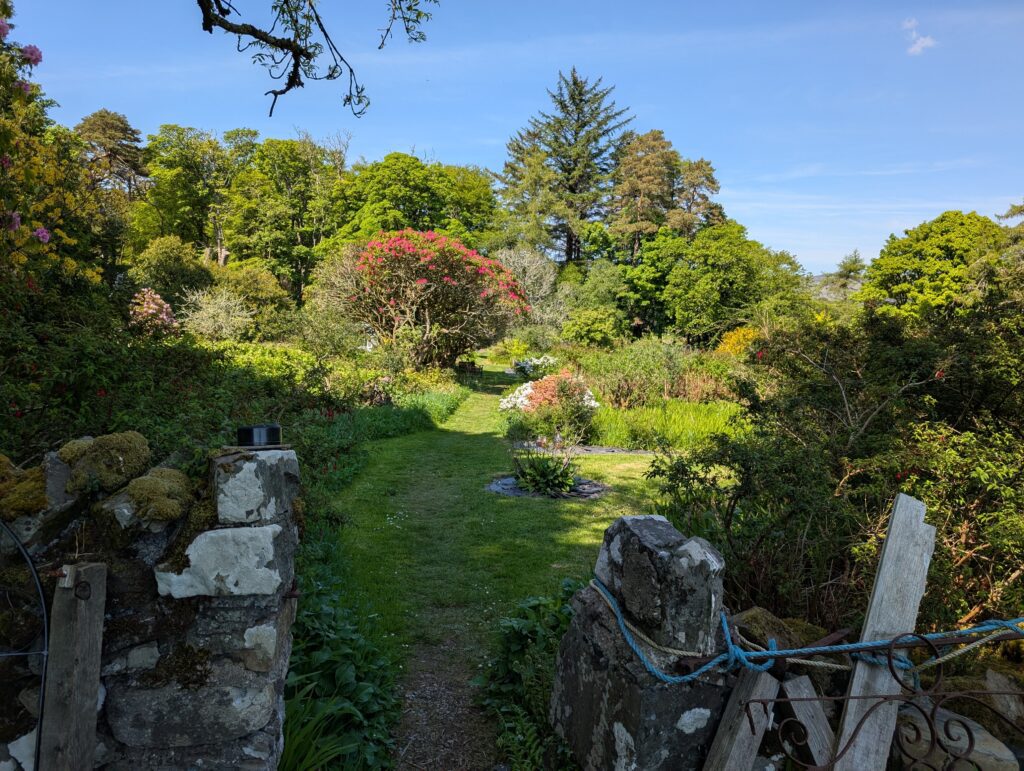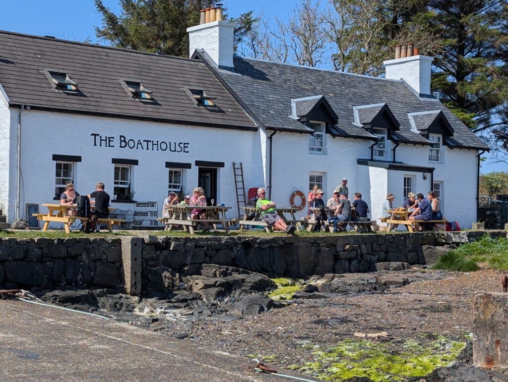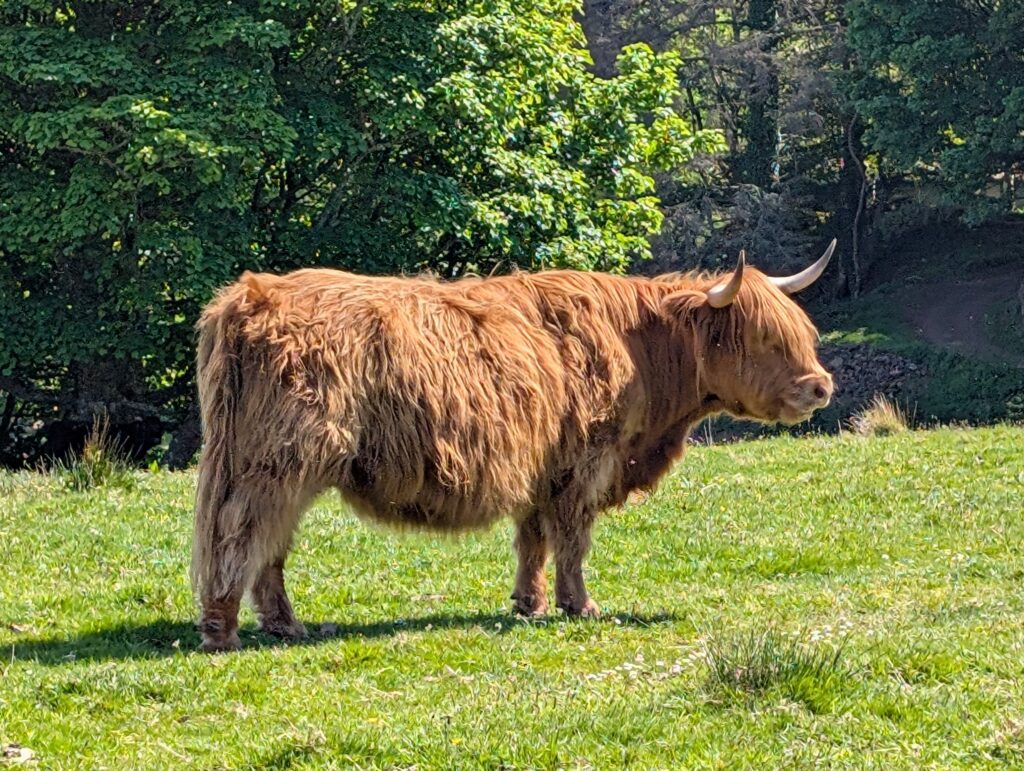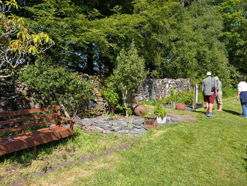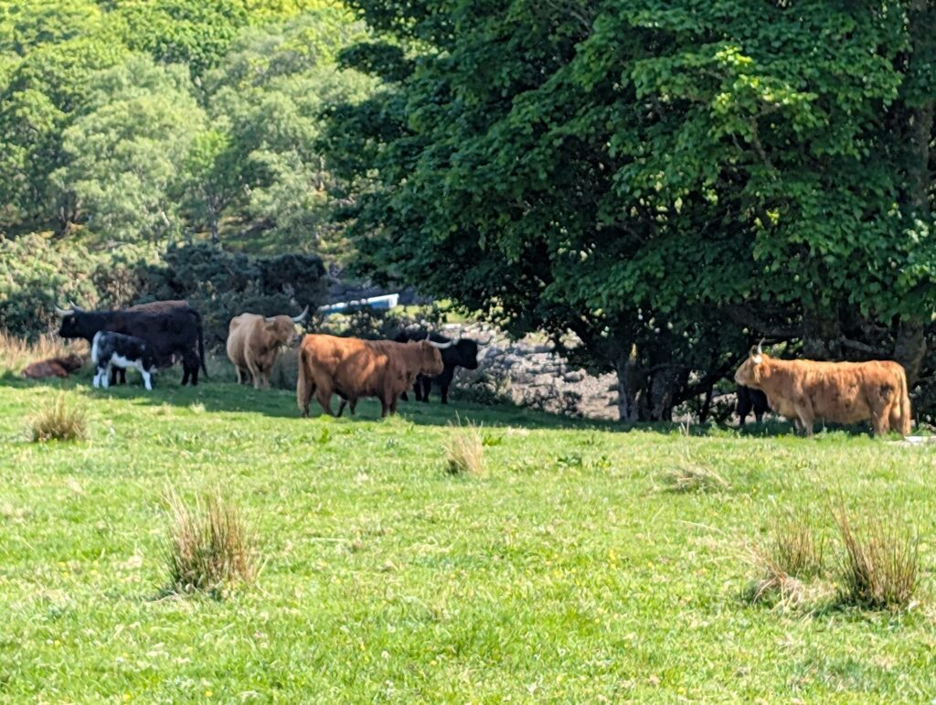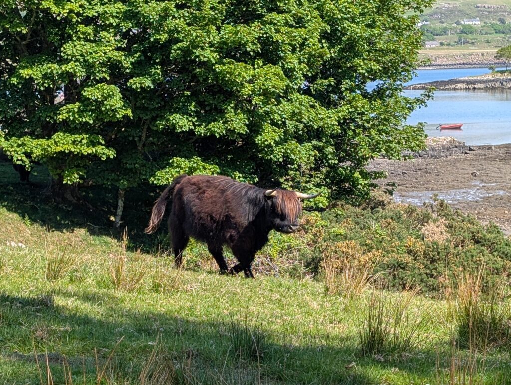 This was not what most would think of a ferry. You park your car, slide a little piece of wood that singles the ferry man to come get you and he drives over in his little fishing boat. You get on and he takes you over. On the Isle of Ulva there is a little pub called The Boathouse. It is new people running it and they make amazing gourmet food. We arrived at lunch time and the only table available was a picnic table that had half the table sinking into the ground, but we got our food balanced and ate, while talking to a couple at the table with us. They told us of Ulva Garden on the isle and that we should go check them out. The woman was helping to restore the gardens. We did walk and find the garden, having to walk through a heard of Highland Cattle along the way. They are a work in progress from being neglected for many years, but it will be gorgeous.