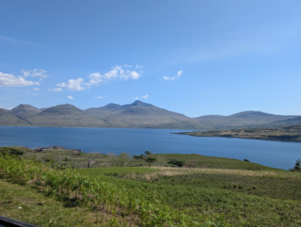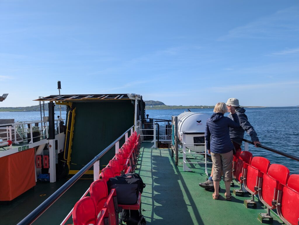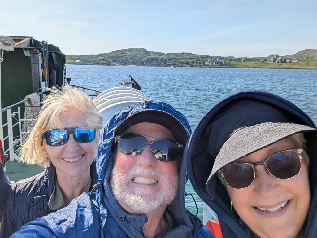 We took the ferry back across and headed off for the ferry at Fionnphort to get to Iona. It was going to be very close on time as all the roads we would be driving would be one lane roads. If we did not make this ferry, there would not be another till the next day. Even though we were rushing and listening to the audio book none of us took for granted each and every view we saw. Just so much beauty along the way, and so remote. So many tiny little clusters of homes with a shop or pub along the way. I couldn’t even imagine what life out this remote would be like. We also knew that the weather we were experiencing was not normal. Everyone commented on it as we traveled. People apologized for how warm it was and that it was so very sunny. It was clear that it should have been very overcast with strong winds and cooler temperatures. We enjoyed it.