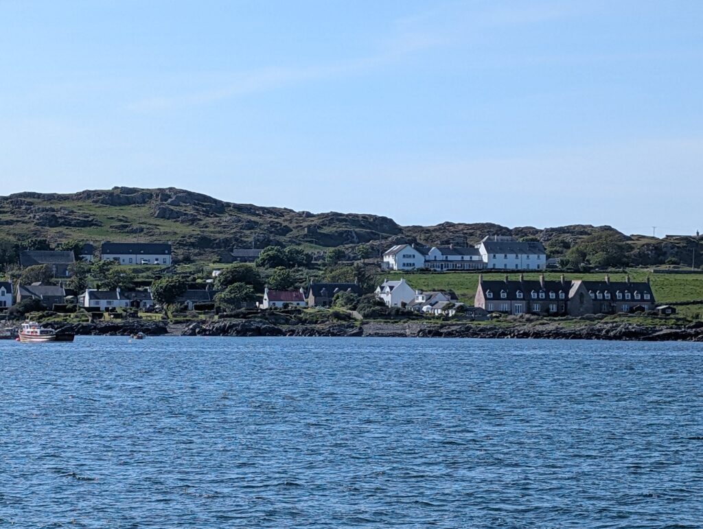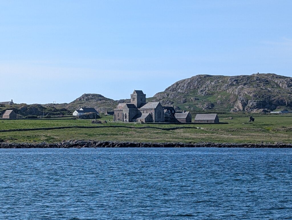We did not take the car over to Iona, so when we arrived, we quickly jumped out and grabbed our stuff. Fiona ran in and made sure we could get on the Ferry that was about to disembark, while Perry got a parking pass and Becky and I grabbed stuff. We made it, barely. The ferry is only about 10-15 minutes, but Iona is really amazing. It is where Iona Abbey is located that was founded by the monk Columba who came from Ireland in 563 AD. The island only has a population of 120 people. The Abbey and a few places to stay and some restaurants is really all the town is made up of. We all checked into our respective hotels and then we met up for dinner at Perry and Fiona’s hotel for dinner. Our hotel was nice, but when we got to our room it faced the southwest and the sun had been baking it all day. This is not usual a problem on Iona, because the sun does not shine like it has of recent days. The hotel was nice enough to find us a fan to help cool down the room since there are no AC units in most of the UK, except for very modern buildings in major cities. It cooled down before we went to bed.