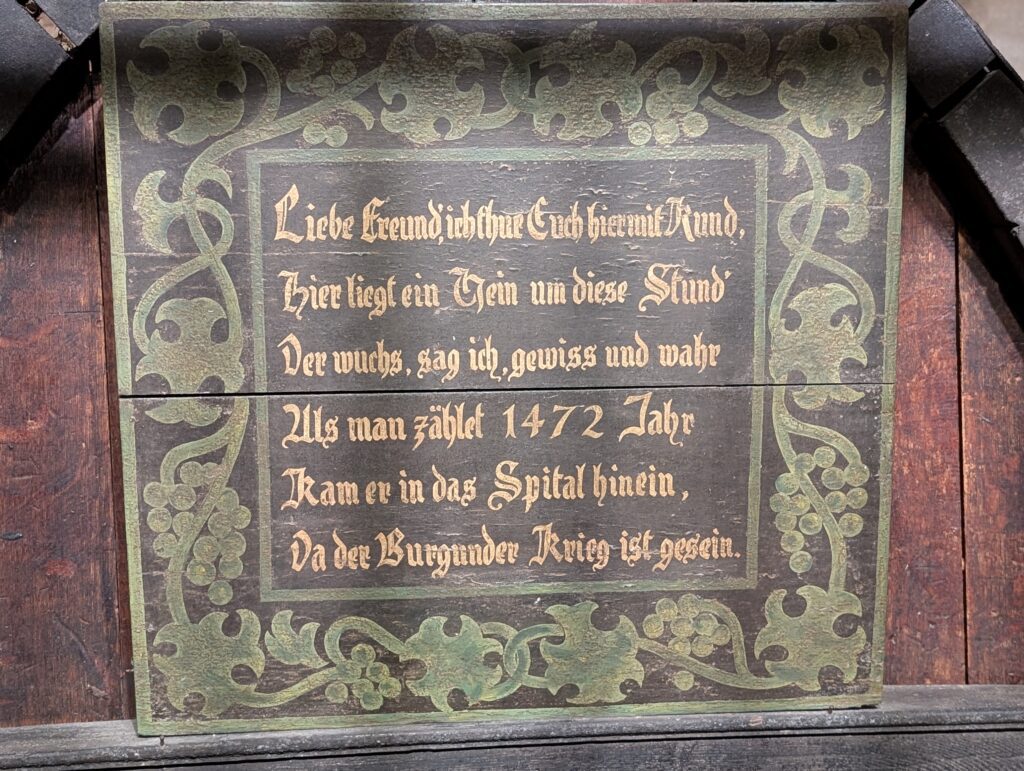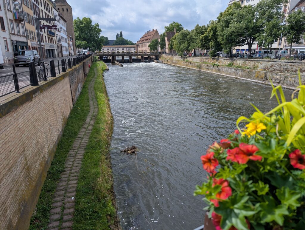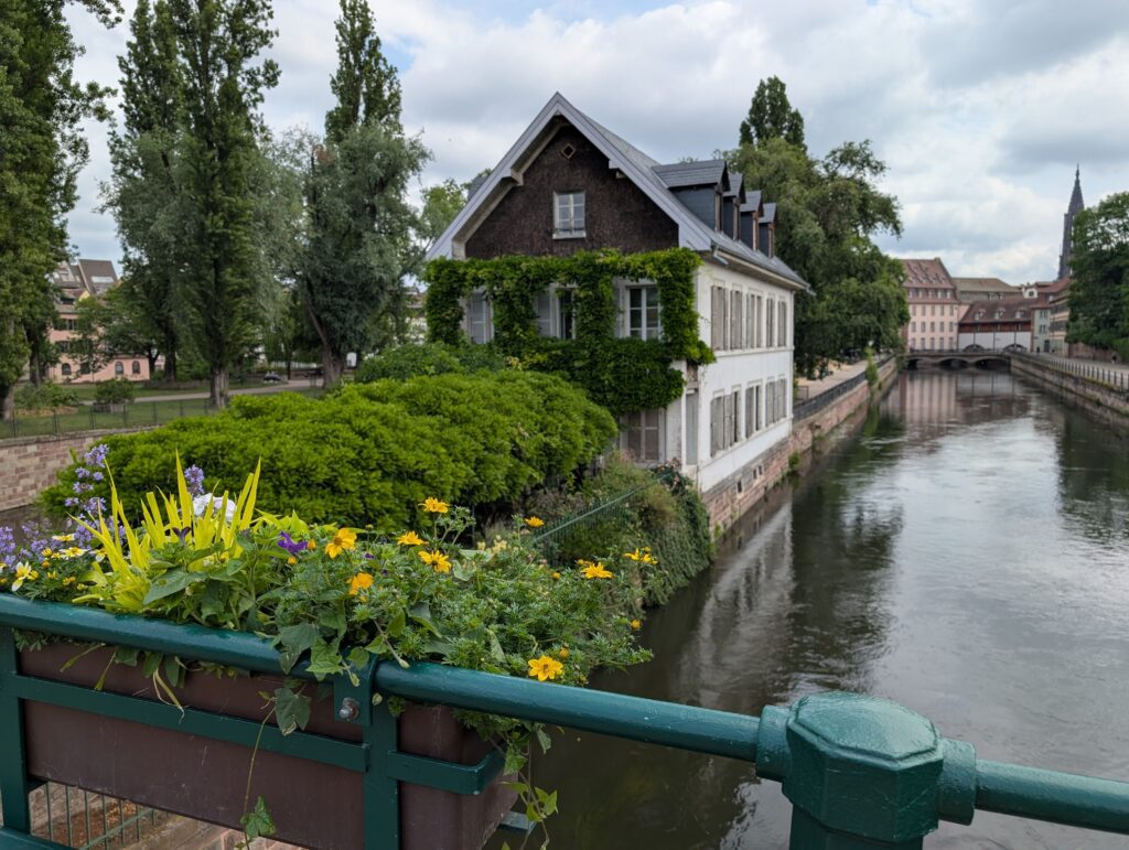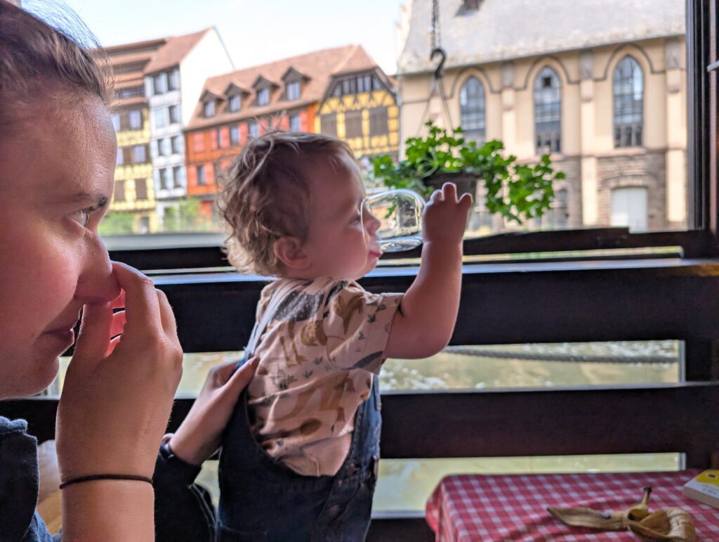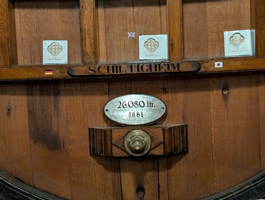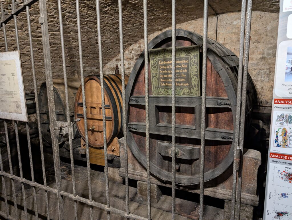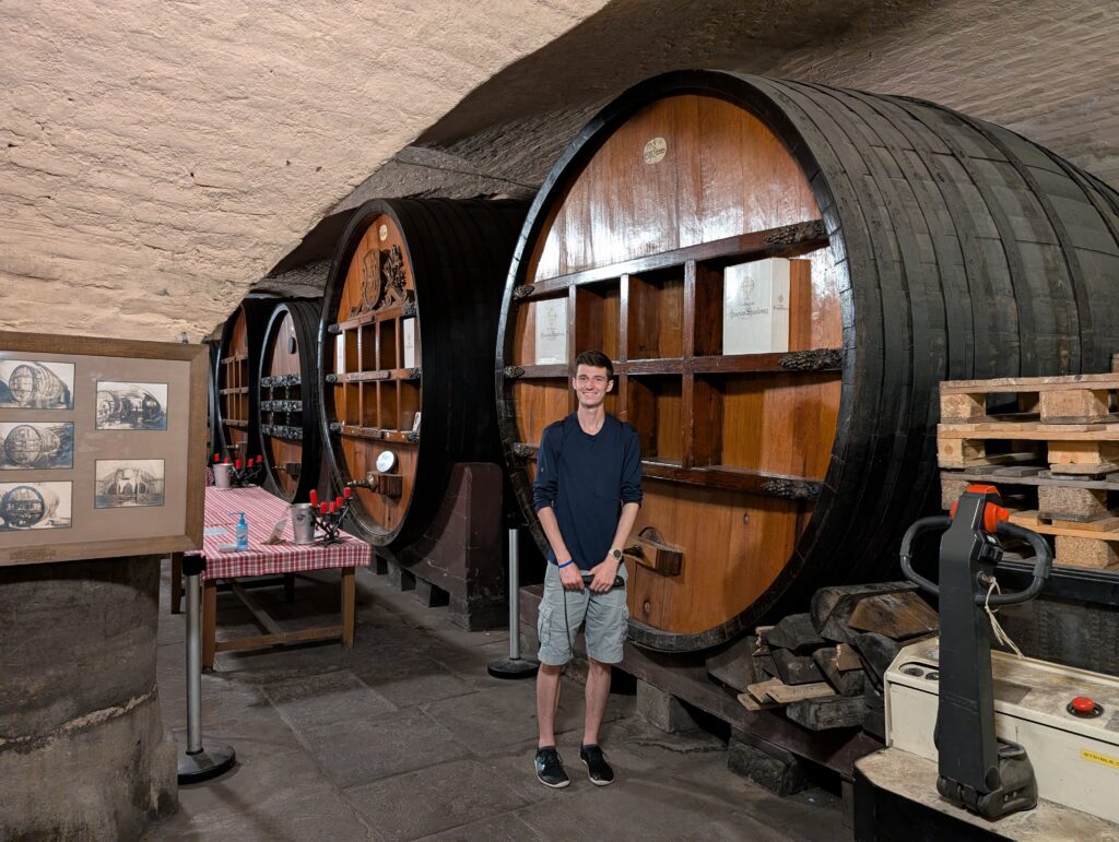 We walked around and saw the area they call “Little France” and along the different parts of the Ill River that flow through the town. We eventually found a Restuarant built into the bank of the Ill River and had lunch. Jamie very much enjoyed watch the river flow by the window. We then headed off to tour the last remaining, currently working, wine cellar that is the basement of a hospital. There used to be many hospitals with wine cellars as this was a way for people to pay for their medical care. They would sell wears from their vineyards to the hospital to pay for their care. To not lose this one a group of wineries gathered together to still use this particular one. It also has a cask in the cellar with wine that dates back to 1472. Only three times has the wine been tasted, with the last being when the city was liberated at the end of WW2.