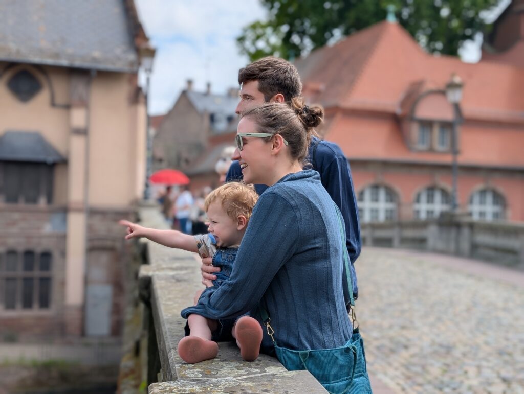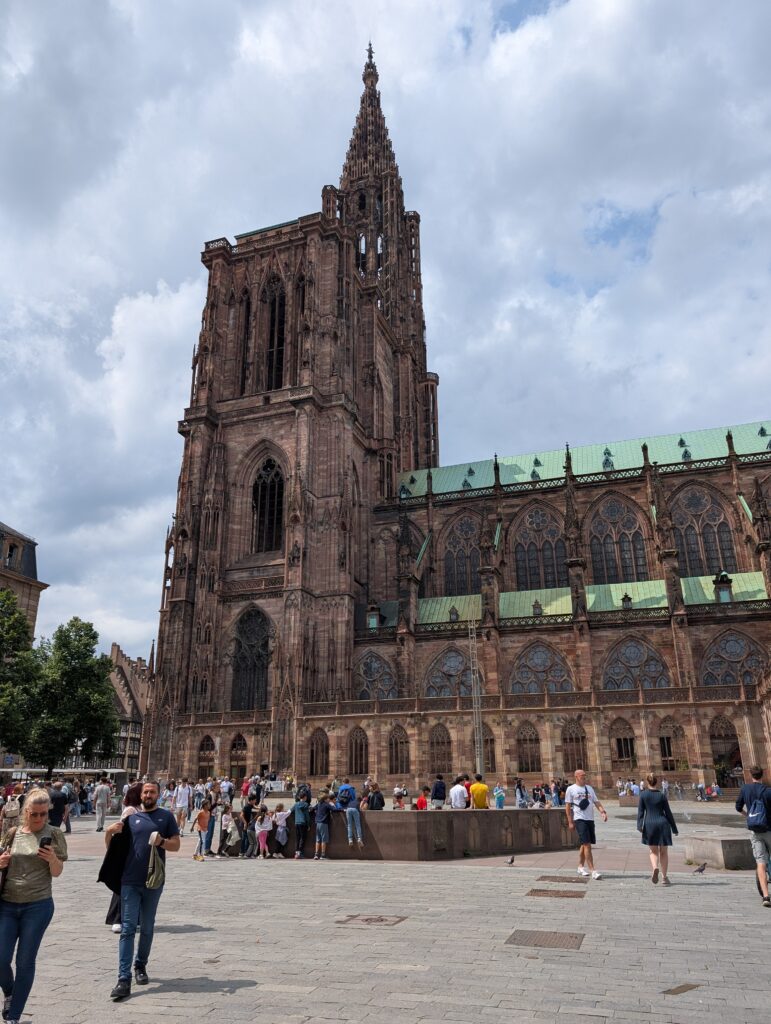 We then went by the Strasbourg Cathedral. I was the only one who went in, and it was huge and beautiful as they all have been. The one element of this cathedral is the astronomical clock that is in it. It stands 60 feet high and keeps track of the plants, years, months, days, hours, seconds. It has gone through many iterations and is beautiful as well as amazing to see. After that we needed some hot drinks and some pastries and to let Jamie run and play. We found a park and Mark met a German man who pastors a church in Germany, and they had a great conversation.