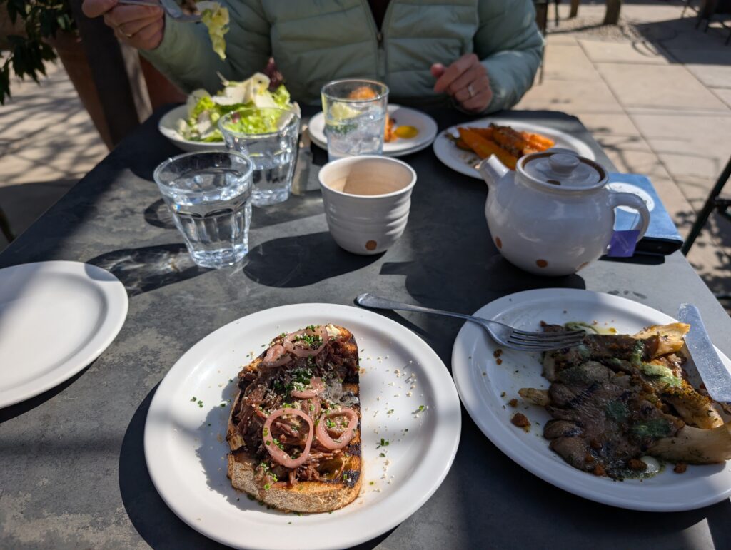 Becky and I headed out at 9:15 to go to Paddington station and ride out to our first town. The ride out was crammed and at one section along the way many people were standing. I had never seen a railway train that full. We arrived late morning in the town of Charlbury, our first stop of the day. The train station was a bit out of town, but it was a very lovely walk to the town. Every building in the town was built out of the Jurassic limestone the area is known for, and I mean every building. The population is only 2,800 and the town has a history that dates back to 7th century. We just walked different streets. It was all just so gorgeous. The streets were very narrow as were the sidewalks. Many times, we had no choice but to walk on the road. We got lost at one point and met a very nice man named Fred. He was a retired architect who has lived in the town since the 1970’s. He was working on a Ford jeep from WWII. He told us some of the history of the area and we learned a bit about him. He had taken the house he had lived in and added rooms to it and then had built several of the homes across from his house. We then moved on our way and found the nice little pub called “The Bull”. We ended up sitting outside which was very nice as the sun was brightly shining. We had one of the most delicious meals we have had in the UK. It was just light fare. I had oyster mushrooms and shredded beef on sour dough. Becky had a salad, cooked carrots with a delicious crust on them and amazing sausage roll. We then worked our way back to the train station.