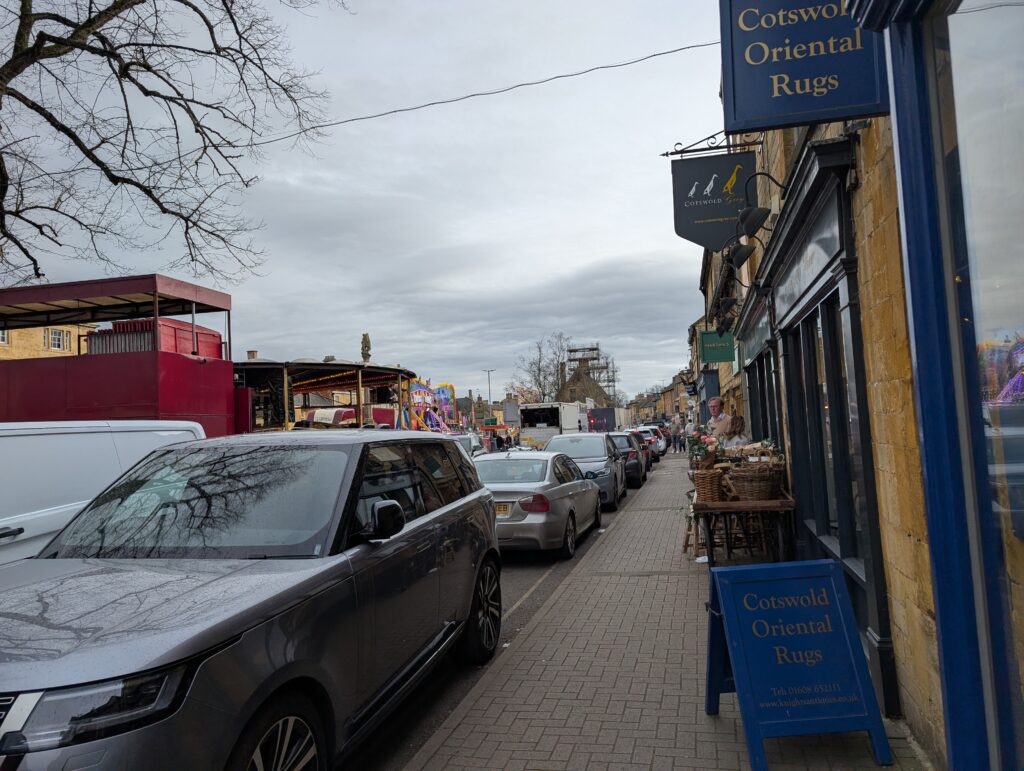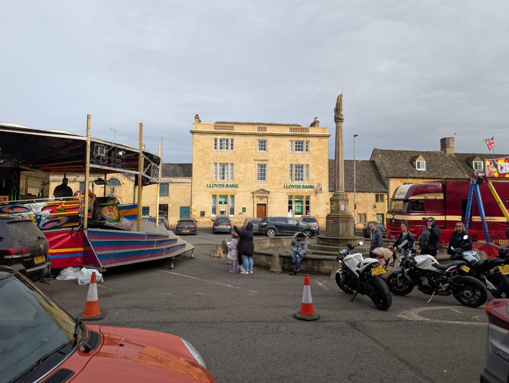 We slowly made our way back to the train station and once again made it with about 5 minutes to spare before the next train arrived to take us the 7-minute trip to Moreton-in-Marsh. The town was a very short walk from the station. This town was the biggest of three with wide streets and sidewalks. Running down the high street was a center area were there was a carnival going on with amusement park rides going. The buildings all were still made out of the Cotswold stone that we had been seeing. This town also dates back to around 500 AD and the Roman time period. The main street of the town may have been part of the Roman road through this area. The town has been in the hands of many different individuals and different churches down through the ages. It was just so open, flat and big in comparison to the other two town we were in.